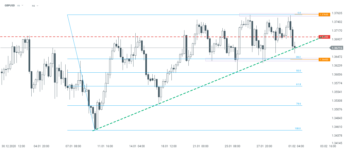GBPUSD ponownie nie był w stanie utrzymać się powyżej okrągłego poziomu 1,3700. Aktualnie obserwujemy kolejny atak na linię poprowadzoną po ostatnich minimach, co może skutkować wybiciem w dół. Ewentualna przecena może przyspieszyć po pokonaniu wsparcia przy 1.3640. Źródło: xStation5