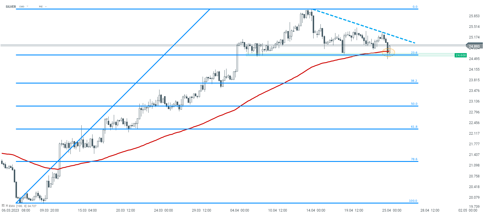 Patrząc na wykres srebra na interwale H4, można zauważyć potencjalną formację głowy i ramion. Niemniej pierwszy test linii szyi zakończył się niepowodzeniem, przez co możliwe jest wznowienie ruchu wzrostowego. Strefa przy poziomie 24,60$ pozostaje kluczowym wsparciem w krótkim terminie. Silver interwał H4. Źródło: xStation5