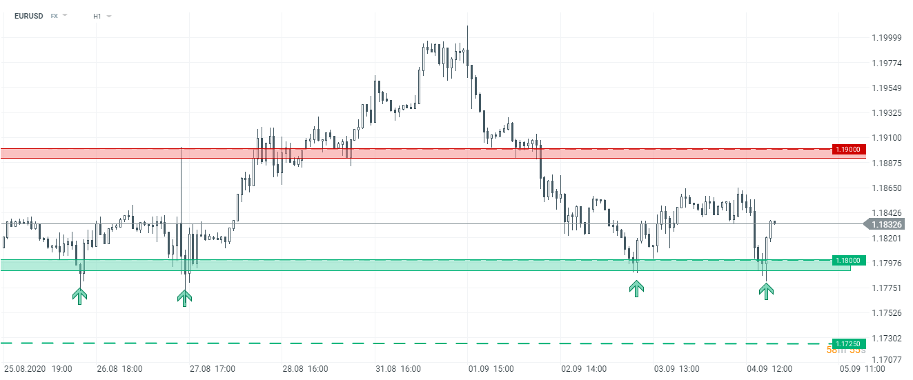 EURUSD po raz kolejny nie zdołał przebić poziomu 1,18. Po odbiciu od wspomnianej bariery dolar amerykański znów się osłabia, a główna para walutowa zaczyna zmierzać w kierunku 1,19. Źródło: xStation5