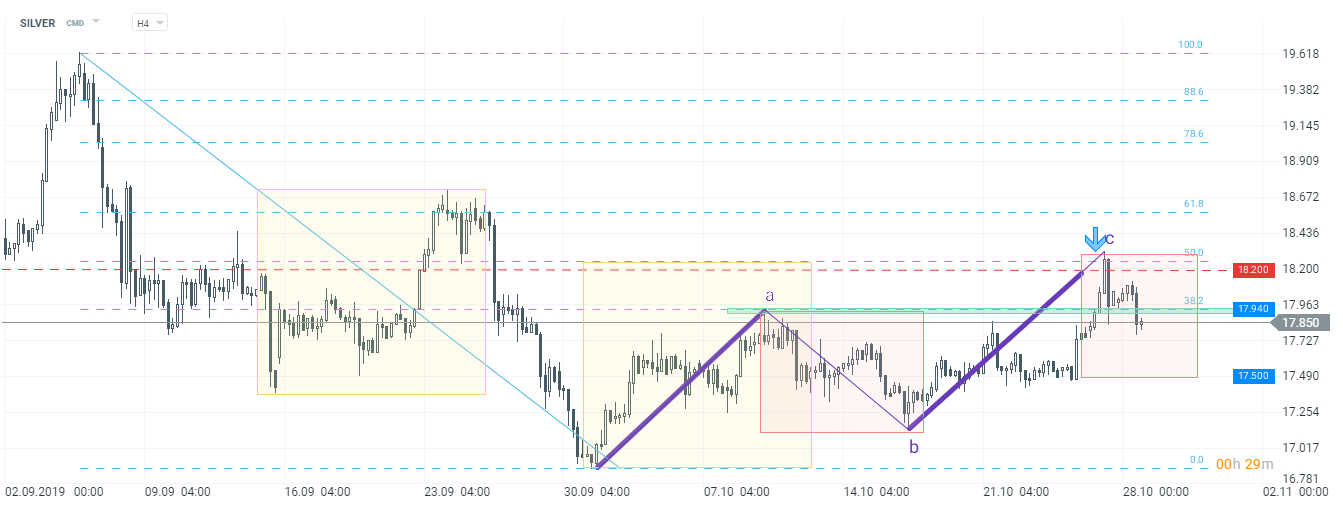 Pozytywne nastroje na rynku akcji przekładają się na spadki cen metali szlachetnych. W godzinach wieczornych cena złota znajduje się na 0,9% minusie, a srebro zniżkuje powyżej 1%. Patrząc technicznie na srebro, doszło do wybicia dołem strefy przy 17,94$ (o takim scenariuszu wspominaliśmy w dzisiejszym Alercie technicznym), tym samym droga w kierunku dolnego ograniczenia lokalnego układu 1:1 (czerwone prostokąty) jest otwarta. Docelowy rynek ma nawet szansę na atak minimów przy 16,90$. Scenariusza wzrostowego należy z kolei oczekiwać w momencie powrotu ceny powyżej poziomu 18,20$.