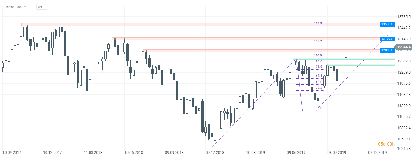 DAX kontynuuje wzrosty, indeks znajduje się najwyżej w 2019 roku. Najbliższy kluczowy opór znajduje się przy poziomie 13 160 pkt. Źródło: xStation5