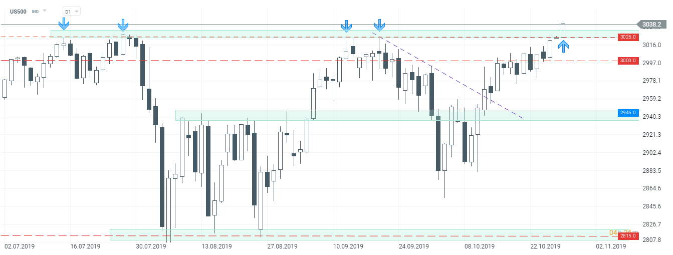 US500 znalazł się dziś na najwyższych poziomach w historii, tym samym strefę przy 3025 pkt należy traktować jako wsparcie. Źródło: xStation5