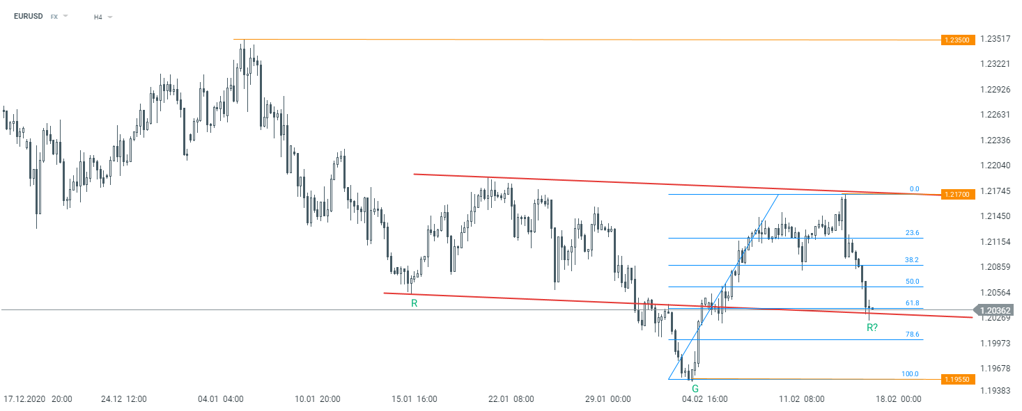 Na parze walutowej EURUSD może budować się potencjalna formacja odwróconej głowy z ramionami. Aktualnie notowania znajdują się w rejonach potencjalnego prawego ramienia formacji. Jeżeli jednak do odbicia nie dojdzie, po pokonaniu mierzenia 61,8% Fibonacciego przecena może przyspieszyć w kierunku ostatnich minimów przy 1,1955 USD.