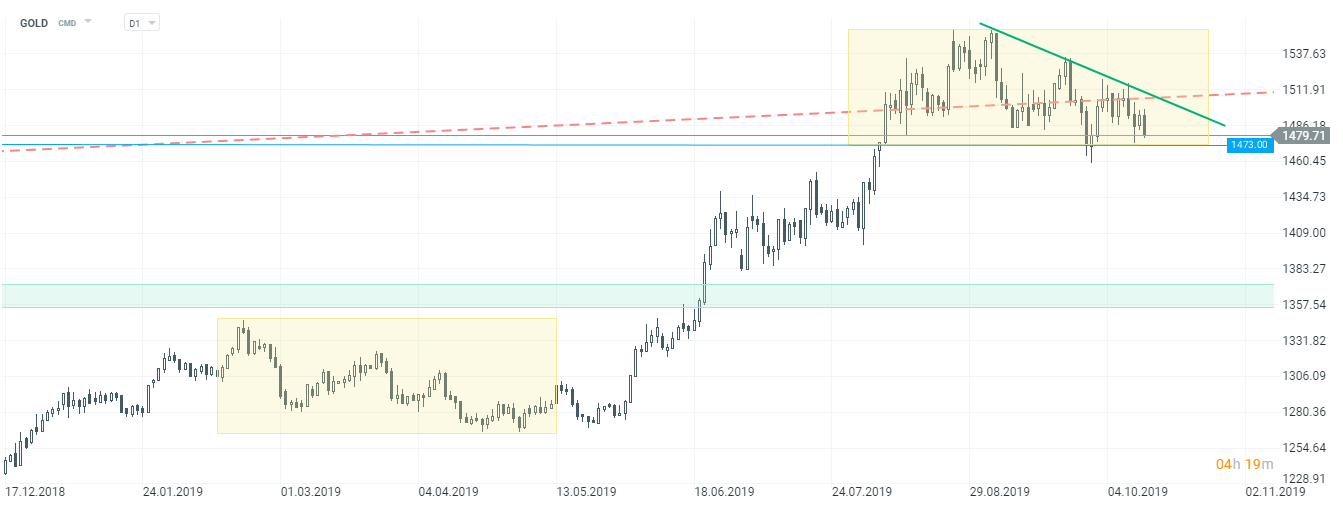 Wzrosty na rynku akcji sprzyjają przecenie na złocie. Cena tego surowca zniżkuje dziś blisko 1%, tym samym za uncję zapłacimy poniżej 1480$. Na interwale D1 co prawda cały czas obowiązuje trend wzrostowy, niemniej w momencie pokonania dolnego ograniczenia układu Overbalance może się okazać, że korekta spadkowa przybierze na sile. O scenariuszu wzrostowym będziemy mogli natomiast mówić w momencie kiedy zostanie pokonana linia trendu zaznaczona kolorem zielonym.