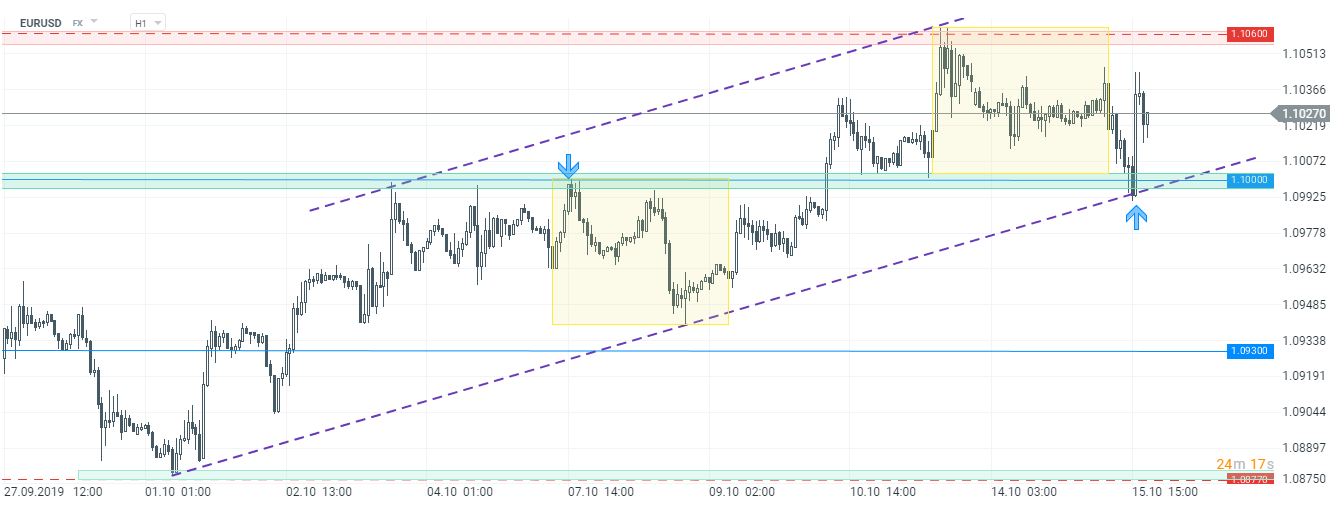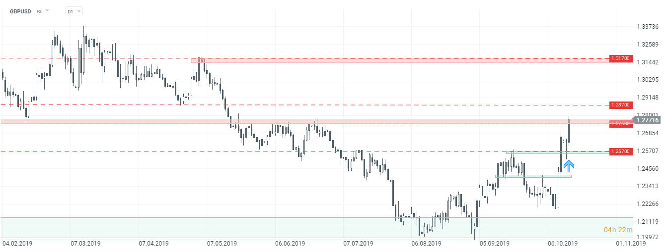 Jeżeli chodzi natomiast o parę walutową EURUSD, tutaj ponownie analiza techniczna została wypełniona przez pozytywne doniesienia w sprawie Brexitu. Początek sesji przebiegał raczej negatywnie, euro traciło do dolara, niemniej cena po dotarciu do strefy wsparcia przy poziomie 1,10, o którym wspominaliśmy w poprzednich analizach, ruszyła mocno w górę . Tym samym wsparcie pozostaje kluczowe, natomiast opór znajduje się na wysokości ostatnich szczytów przy 1,1060. Dopóki jeden z tych poziomów nie zostanie wybity, rynek może poruszać się w konsolidacji.