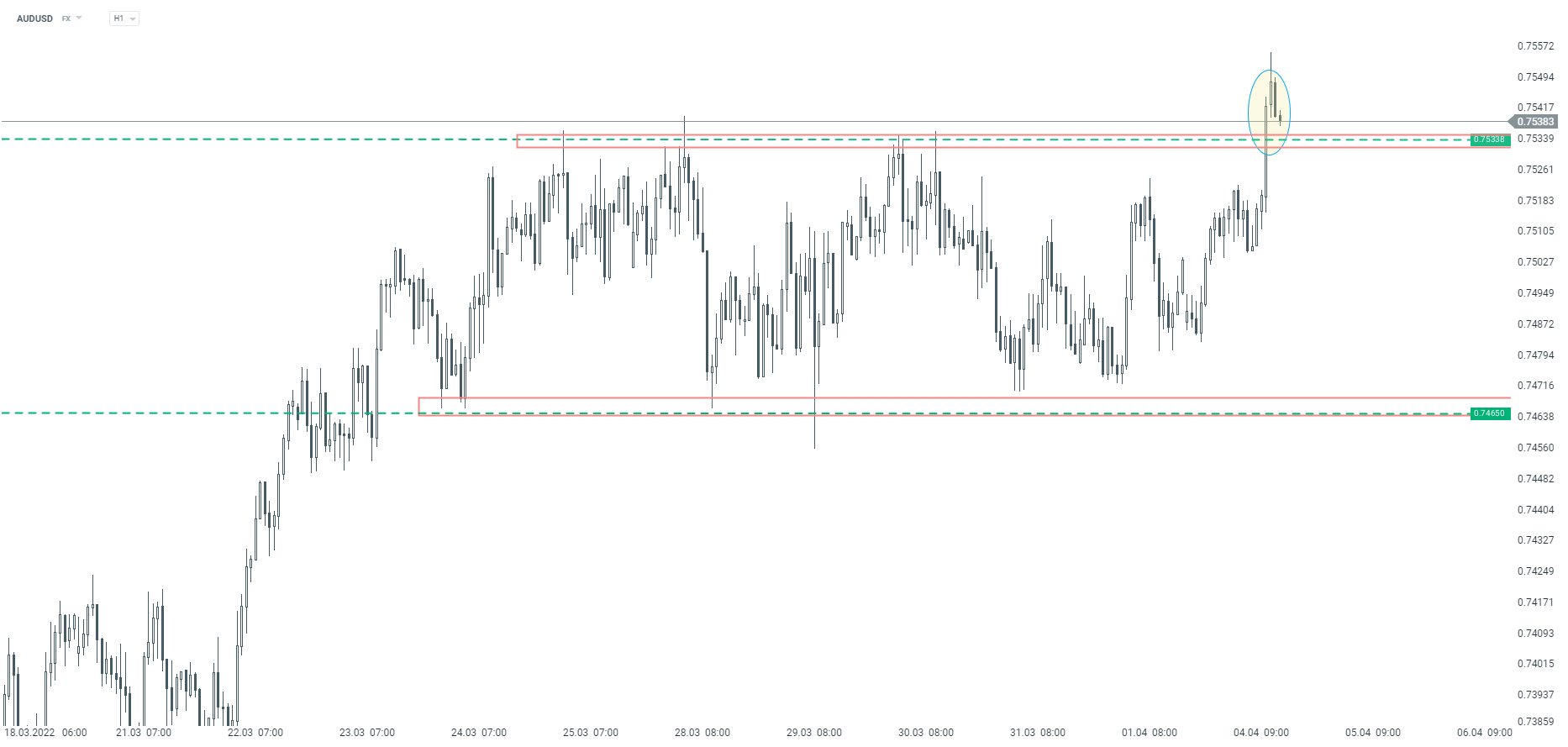 Notowania AUDUSD wybiły górą opór przy poziomie 0,7533 i opuściły lokalną konsolidację. Aktualnie obserwujemy cofnięcie, jednak wspomniany opór przy 0,7533 powinien być traktowany jako wsparcie. Jeżeli cena zdoła utrzymać się powyżej, istnieje szansa na kontynuację ruchu wzrostowego. Źródło: xStation5