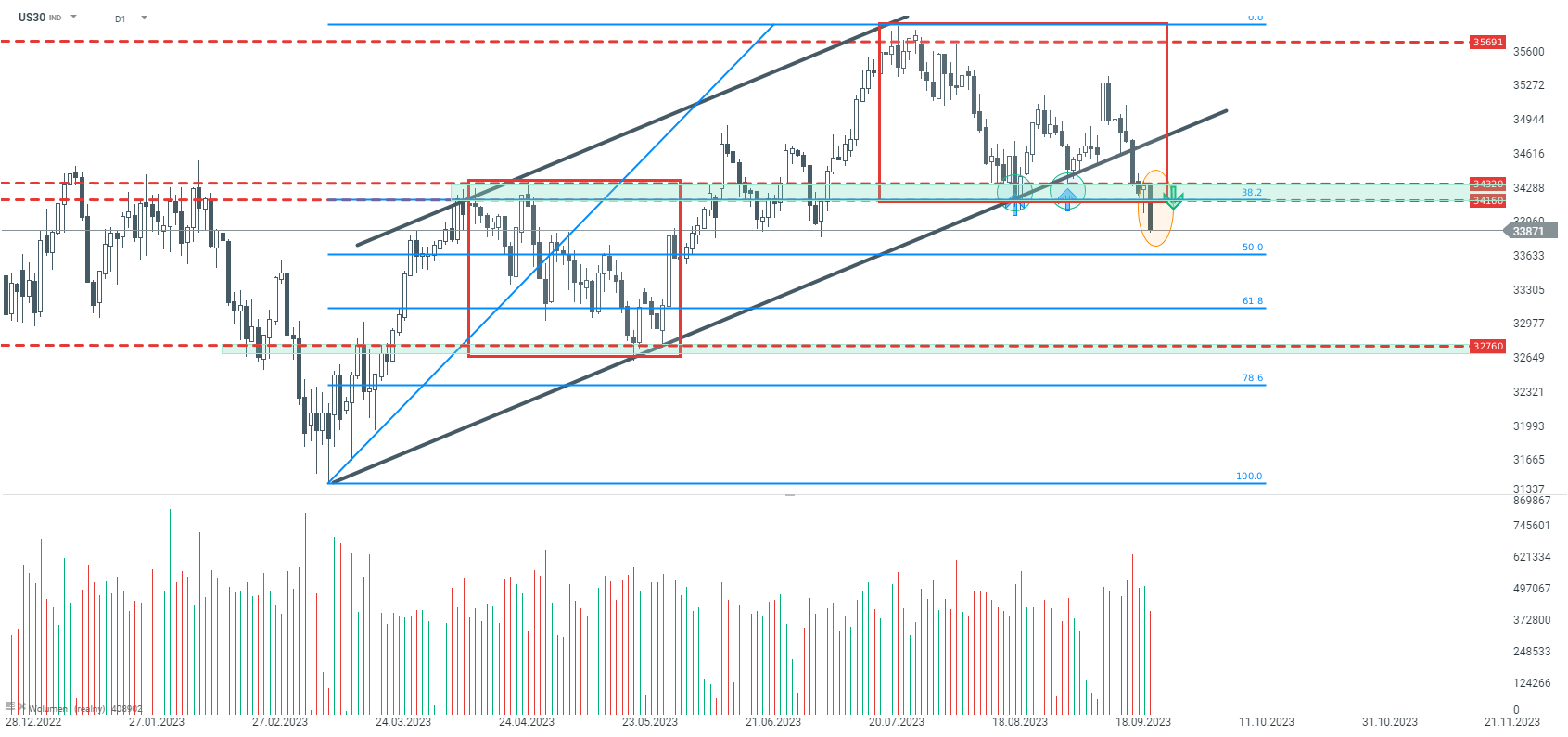 US30 spadł poniżej ważnej strefy wsparcia 34160-34320 pkt, co otwiera drogę do głębszej przeceny. Źródło: xStation5