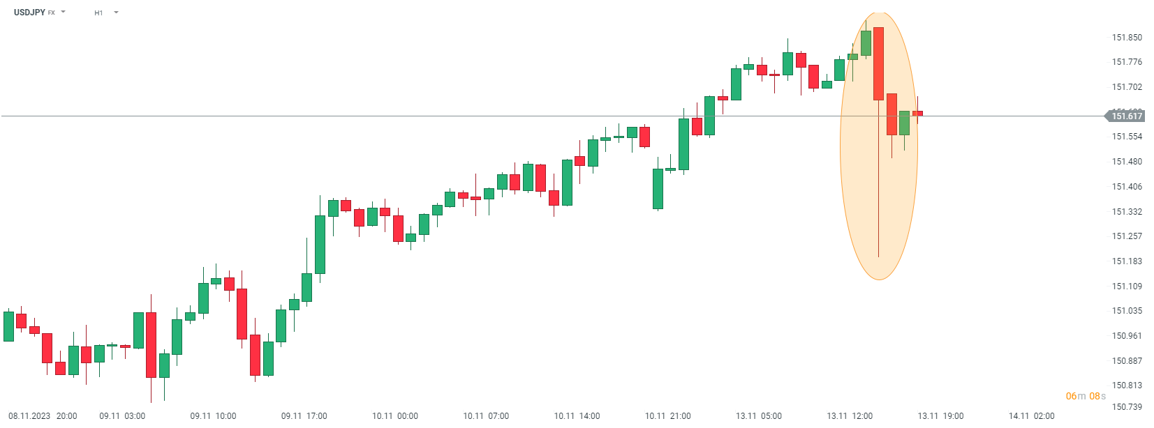 USDJPY gwałtownie spadł po południu, zwiększając spekulacje, że Bank Japonii mógł interweniować, aby wesprzeć krajową walutę. Źródło: xStation5