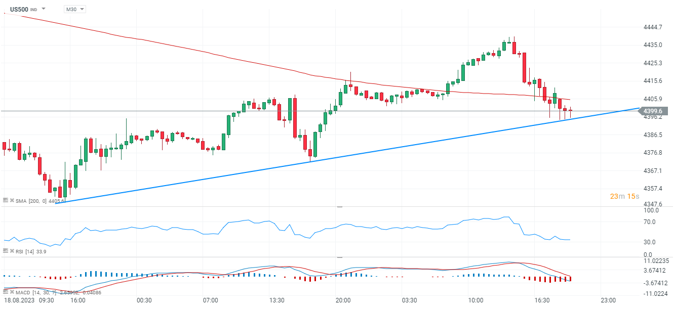 Indeks US500 szybko zredukował wzrosty z początku sesji, traci teraz 0,21% i walczy o utrzymanie linii trendu przy 4400 pkt. Źródło: xStation5