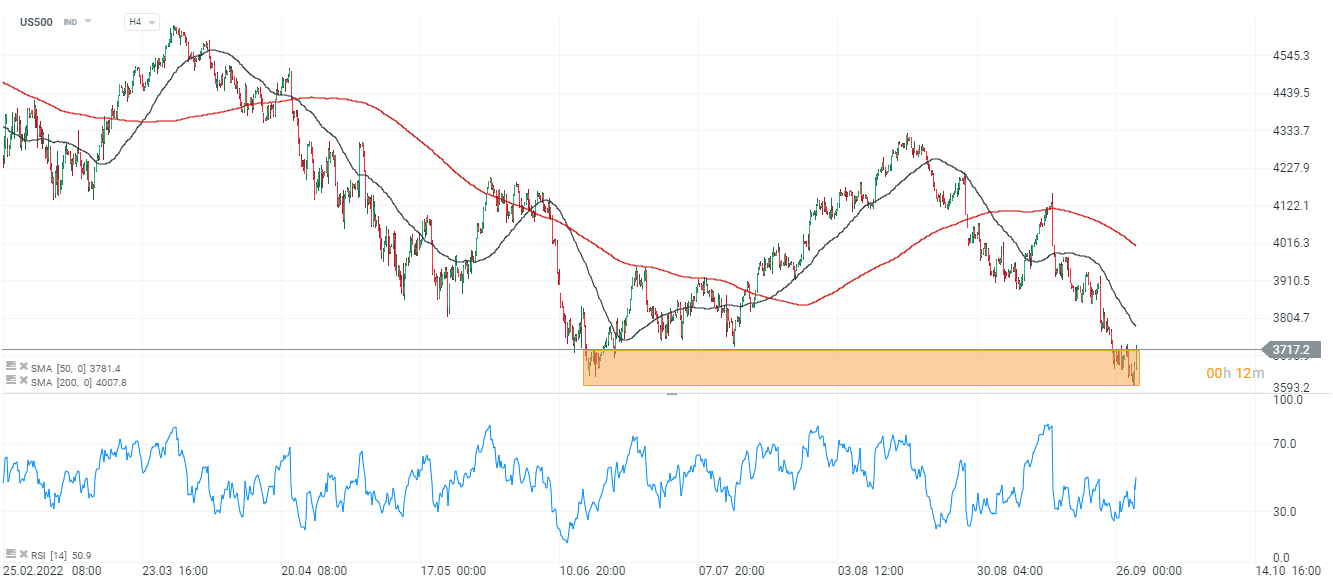 Wykres S&P500, interwał H4. Spadki indeksu wyhamowały w okolicach szczytu paniki z czerwca, bieżącego roku. Indeks wciąż znajduje się w trendzie spadkowym, poniżej 50 i 200 dniowej średniej kroczącej. Reakcję popytu na spadek w okolice 3650 punktów wciąż ciężko nazwać zdecydowaną, inwestorzy wydają się czekać na znak, który ośmieliłby ich by do dalszych zakupów.RSI zdecydowanie wzrosło jednak wciąż pokazuje neutralne poziomy. Źródło: xStation5