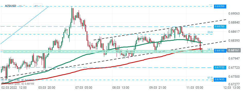 Para NZDUSD gwałtownie spadła podczas dzisiejszej sesji i przełamała się poniżej linii trendu wzrostowego. Niemniej jednak kupującym udało się zatrzymać spadki w okolicach wsparcia na poziomie 0,6815, które zbiega się z 38,2% zniesieniem Fibonacciego ostatniej fali wzrostowej. Jeśli dojdzie do przełamania niższego poziomu, zagrożone może być wsparcie na 0,6773. Źródło: xStation5