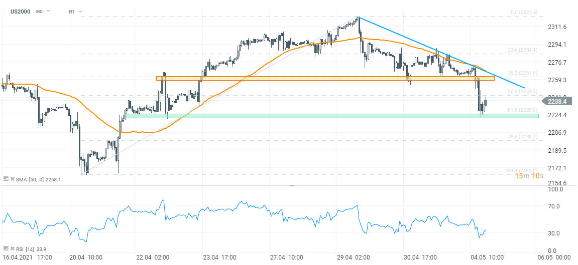 Russell 2000 (US2000), podobnie jak spółki technologiczne, szczególnie mocno tracił w obliczu dzisiejszej przeceny. Spadki na US2000 zostały jednak powstrzymane w okolicy 2 225 pkt (zniesienie 61,8% fali wzrostowej zapoczątkowanej 20 kwietnia) - jest to obecnie ważne wsparcie w przypadku gdyby wyprzedaż miała zostać wznowiona. Z drugiej strony, trwające odbicie może natrafić na strefę oporową w okolicy 2 260 pkt (zniesienie 38,2%). Warto dostrzec również linię trendu spadkowego (niebieska linia), która również może potencjalnie ograniczyć odrabianie strat. Źródło: xStation5