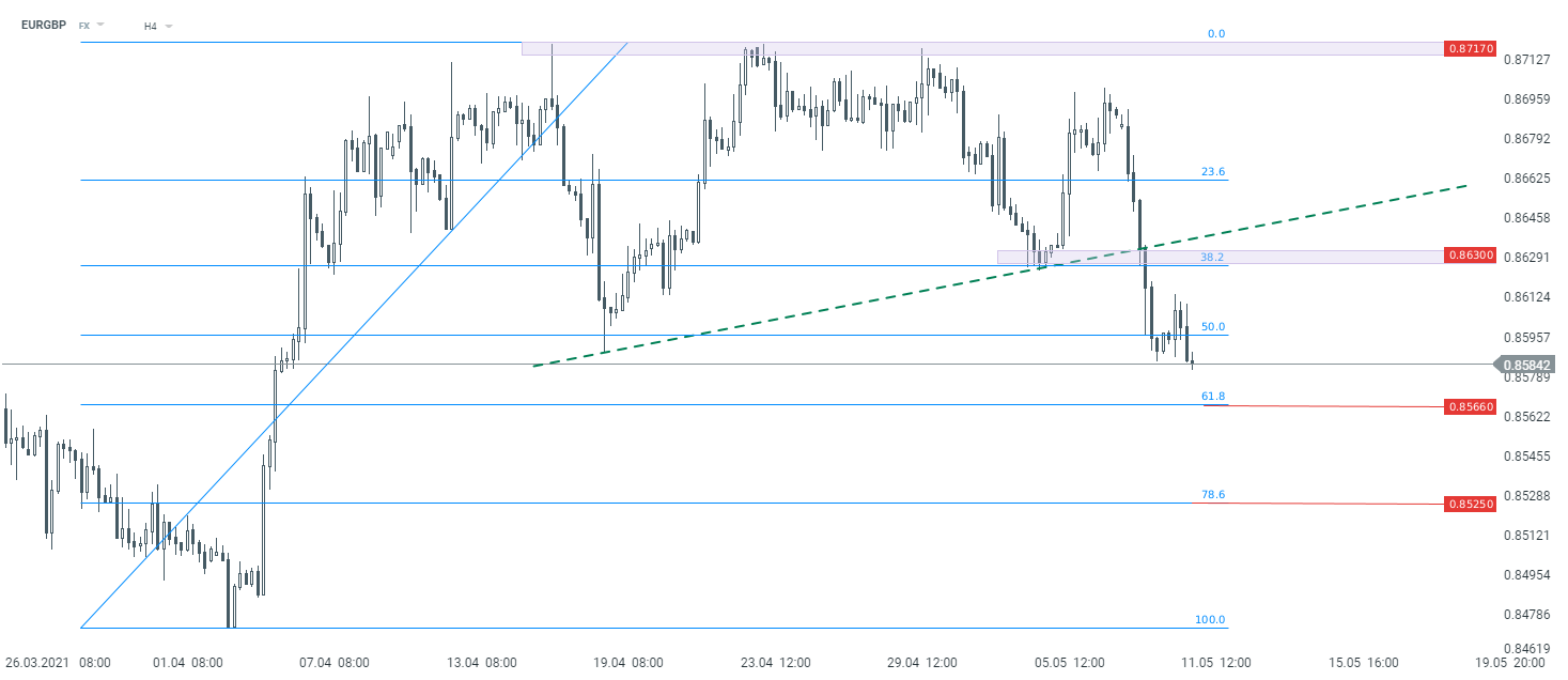 Na parze walutowej EURGBP doszło do pokonania linii szyi formacji przypominającej głowę z ramionami, co może przemawiać za pogłębieniem przeceny. Jeżeli sentyment nie ulegnie zmianie, jako najbliższe wsparcia należy traktować zniesienia Fibonacciego 61,8% oraz 78,6%. Oporem powstają okolice poziomu 0,8630, gdzie znajdują się ostatnie lokalne minima. Źródło: xStation5