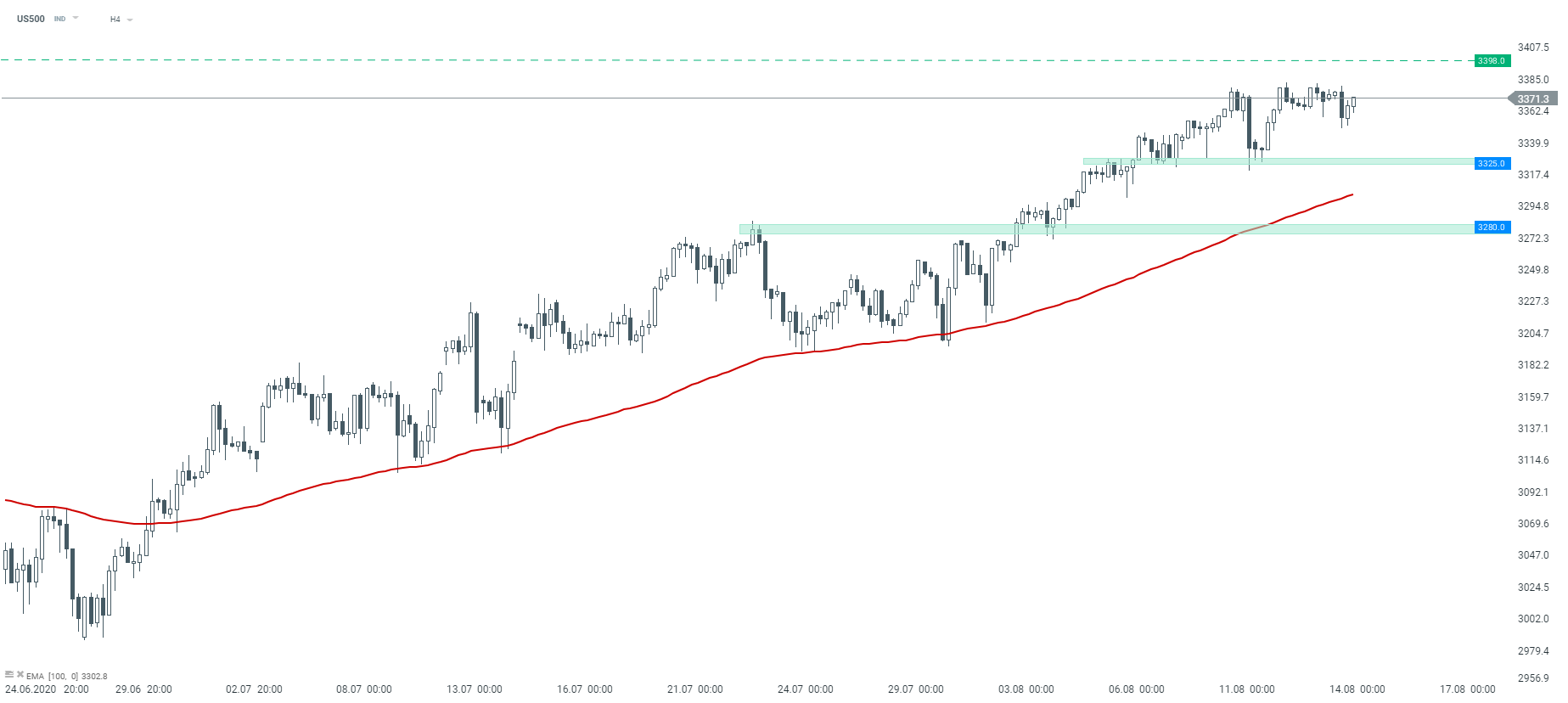 Pomimo mniejszej dynamiki wzrostów, główny trend na US500 pozostaje wzrostowy. Notowania zbliżają się powoli do historycznych szczytów - 3398 pkt. Najbliższe wsparcie stanowi poziom sekwencji przy 3325 pkt. Źródło: xStation5