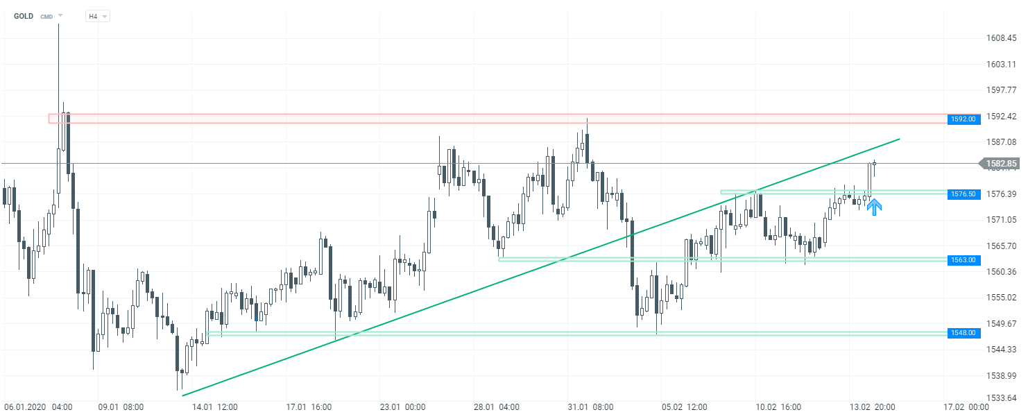 Złoto zyskuje dziś w związku z brakiem kontynuacji wzrostów na rynku akcji. Za uncję w godzinach wieczornym trzeba płacić ponad 1582$. Ruch w górę przyspieszył po publikacji dzisiejszych danych z USA o godzinie 14:30. Tym samym w przypadku kontynuacji wzrostów, istnieje szansa na test wybitej wcześniej linii trendu zaznaczonej kolorem zielonym. Z kolei w przypadku cofnięcia po weekendzie, jako najbliższe wsparcie należy traktować strefę przy 1576,5$.