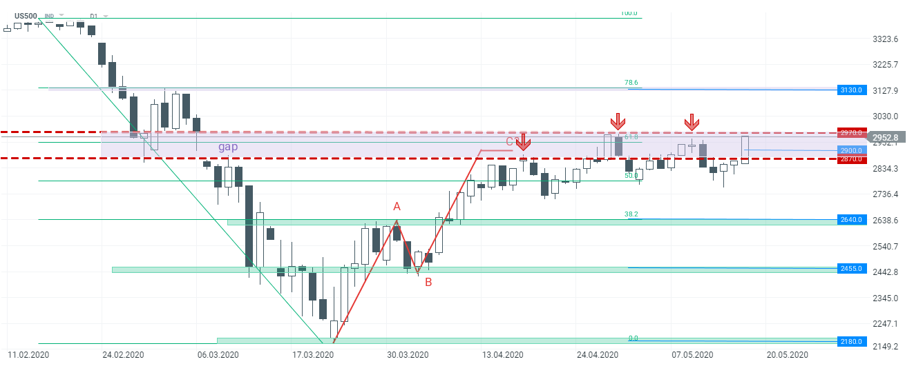 US500 znajduje się coraz bliżej granicy 3 000 pkt. Utrzymujący się sentyment wzrostowy mógłby doprowadzić do potencjalnego ataku na opór 3 130 pkt (zniesienie 78,6%). Podczas dzisiejszej sesji, wszystkie główne indeksy z USA (S&P 500, DJIA, Nasdaq) zyskują około 3 %. Źródło: xStation5