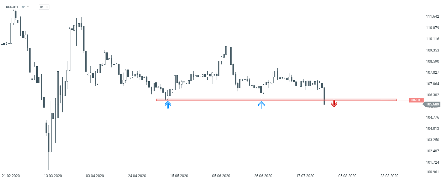 USDJPY wybija wsparcie przy okrągłym poziomie 106,00, tym samym droga do głębszej przeceny została otwarta. Źródło: xStation5