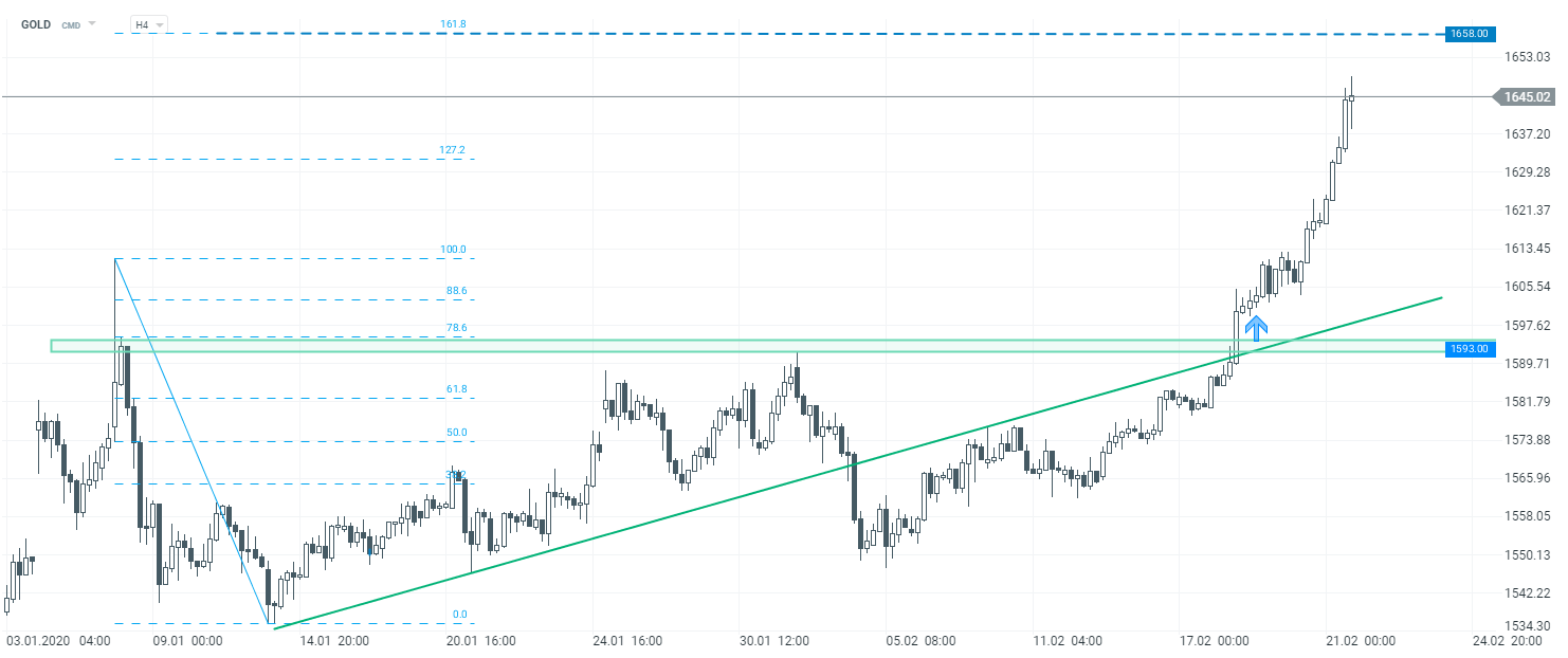 Złoto jest powszechnie uważane za bezpieczną przystań, ceny kruszcu gwałtownie rosną, podczas gdy na rynku akcji obserwujemy korektę. Dziś notowania znalazły się na najwyższych poziomach od 7 lat, a jeżeli sentyment na rynku giełdowym nie ulegnie poprawie, złoto może kontynuować rajd po weekendzie. Jako krótkoterminowy poziom oporu należy przyjąć 1658$, gdzie znajduje się mierzenie zewnętrzne 161,8% Fibonacciego wyznaczone z ostatniej korekty spadkowej.
