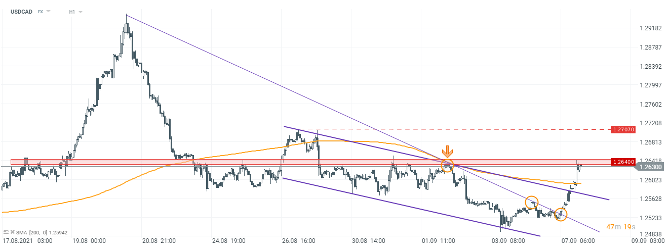 Jutro w centrum uwagi rynków będzie decyzja Banku Kanady (godz. 16:00). Dziś para USDCAD testuje ważną strefę cenową wokół 1,2640. Jak widać na wykresie godzinowym, w ostatnich dniach zachodziły tutaj liczne reakcje cenowe. Warto odnotować, że kurs znalazł się dziś powyżej kilku technicznych przeszkód - linii trendu spadkowego poprowadzonej z wierzchołka z 20 sierpnia, górnego ograniczenia lokalnego kanału spadkowego oraz 200-godzinnej średniej kroczącej. Jeśli doszłoby do wybicia w górę wspomnianej strefy 1,2640, uwaga skupiłaby się zapewne na poziomie 1,2707 (lokalne maksima z 27 sierpnia). Źródło: xStation5
