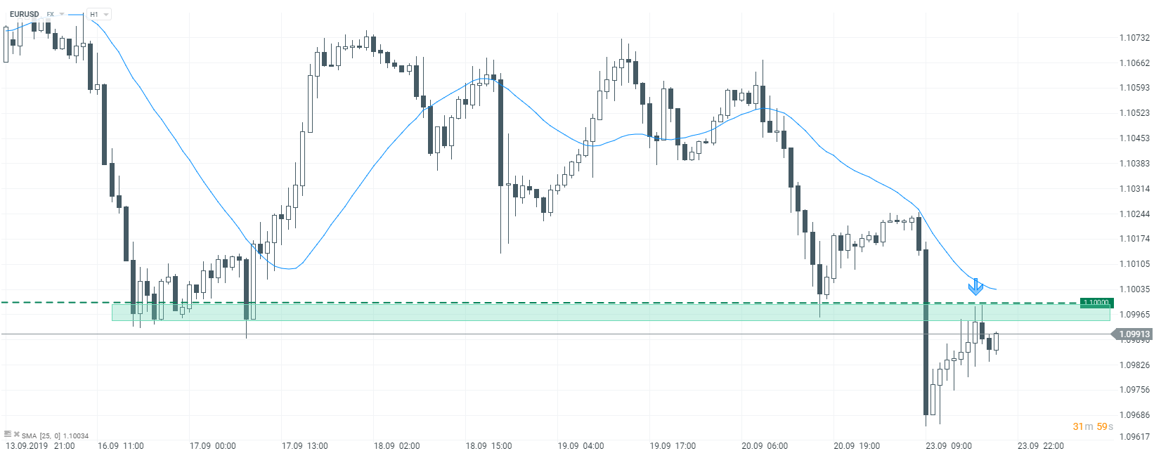 Kurs euro do dolara runął po godzinie 9:30, jednak już od godziny 8:00 utrzymywać się wyraźny niedźwiedzi sentyment. Po tym jak spodki przyspieszyły cena zbliżyła się do poziomu 1,0960. Druga część sesji przyniosła korektę, ruchy był mało dynamiczne, a EURUSD zdołał odrobić 30 pipsów wcześniejszego spadku. Aktualnie kluczowym oporem pozostaje jednak strefa znajdująca się poniżej okrągłego poziomu 1,1000, tak długo jak cena znajduje się poniżej, istnieje szansa na dalszą przecenę.