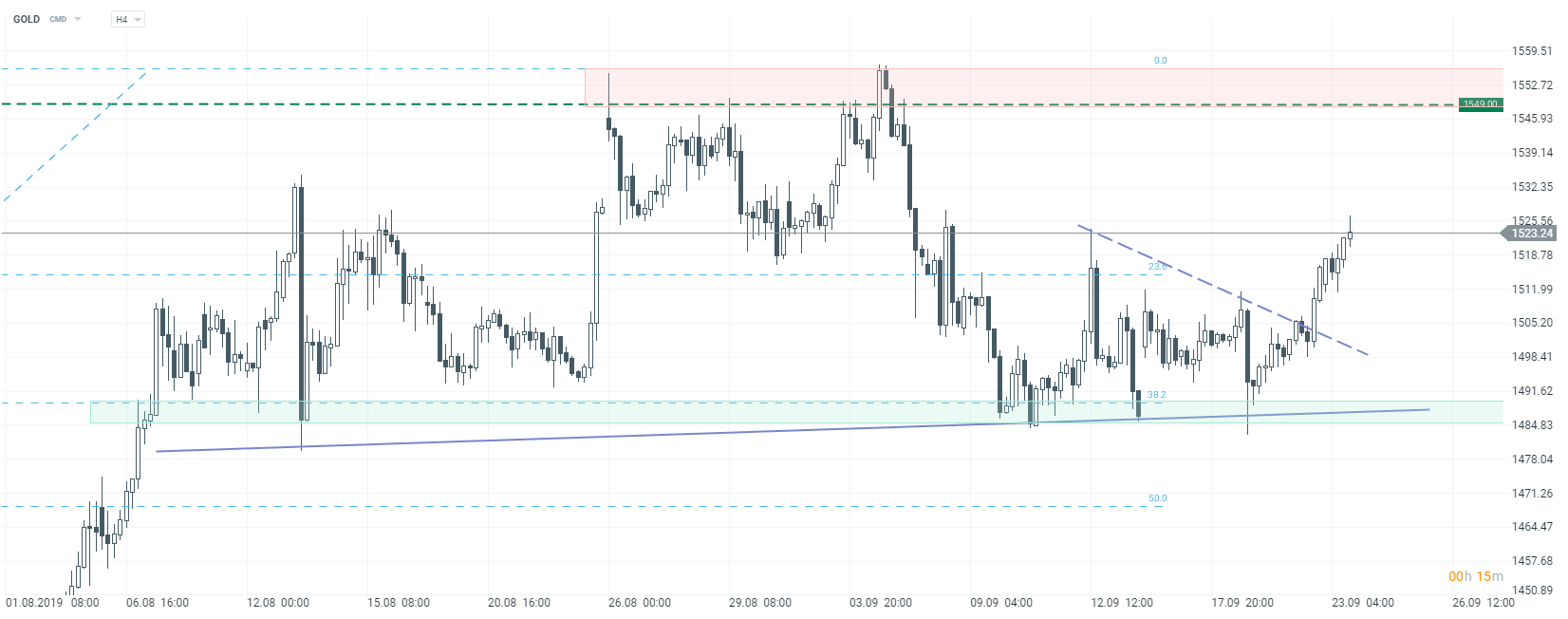 Spore ruchy widać było także na rynku metali szlachetnych. Złoto i srebro zyskało na wartości. W godzinach wieczornych złoto utrzymuje się na niemal 1 procentowym plusie, z kolei ruch na srebrze to aż 3%. Jeżeli obecny sentyment się utrzyma, to w średnim terminie niewykluczony jest ruch w kierunku ostatnich maksimów. Patrząc na złoto co prawda cały czas widać szeroką formację RGR, która może zapowiadać spadki, niemniej wyraźna obrona wsparcia przy 1488$ może napędzać dalsze wzrosty, dopiero pokonanie strefy zaznaczonej kolorem zielonym mogłoby przyczynić się do większej przeceny.