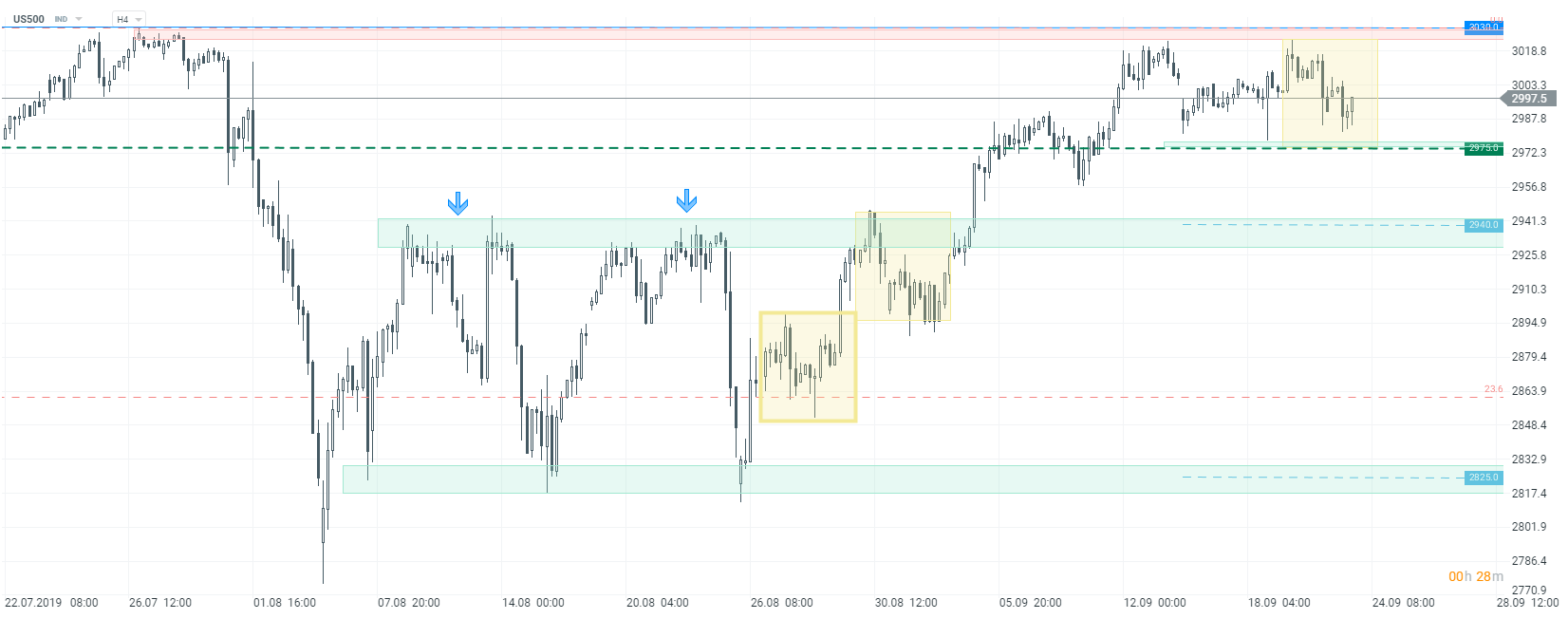 Patrząc na sytuację techniczną na S&P500 (US500), indeks znajduje się nieznacznie poniżej poziomu 3000 pkt. Pomimo braku dużych wzrostów, nie widać również sprzedających. Technicznie najbliższym wsparciem pozostaje poziom 2975 pkt, który wynika z dolnego ograniczenia lokalnego układu 1:1. Dopiero jego wybicie może doprowadzić do większej przeceny. Z drugiej strony trzeba pamiętać, że kolejny atak na ostatnie szczyty przy 3030 pkt, może doprowadzić do kolejnego rajdu wzrostowego. Powyżej tego poziomu z pewnością znajduje się dużo zleceń typu stop.