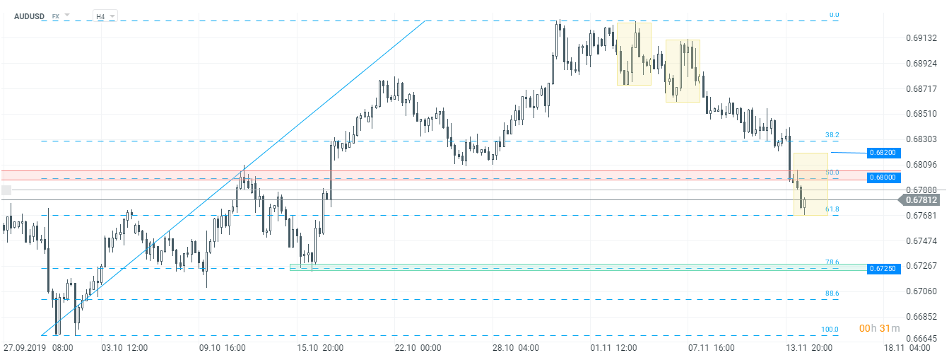 Z kolei na rynku metali szlachetnych widać dziś większą aktywność kupujących złoto znajduje się 0,6% na plusie, a srebro zyskuje 0,5%. Jeśli chodzi natomiast o waluty, największą zmienność mogliśmy dziś obserwować na dolarze australijskim. Para walutowa AUDUSD od początku sesji azjatyckiej znajdowała się pod presją sprzedających. Ruch został zapoczątkowany przez gorsze dane z australijskiego rynku pracy, które zwiększają szansę na cięcia stóp procentowych przez RBA na najbliższym posiedzeniu (w grudniu). Technicznie doszło do pokonania kluczowego wsparcia przy 0,6800, co otworzyło drogę do większej przeceny. Aktualnie, tak długo jak kurs znajduje sie poniżej, należy oczekiwać ruchu w kierunku poziomu 0,6725. Lokalnie wsparciem jest mierzenie 61,8% ostatniej fali wzrostowej.