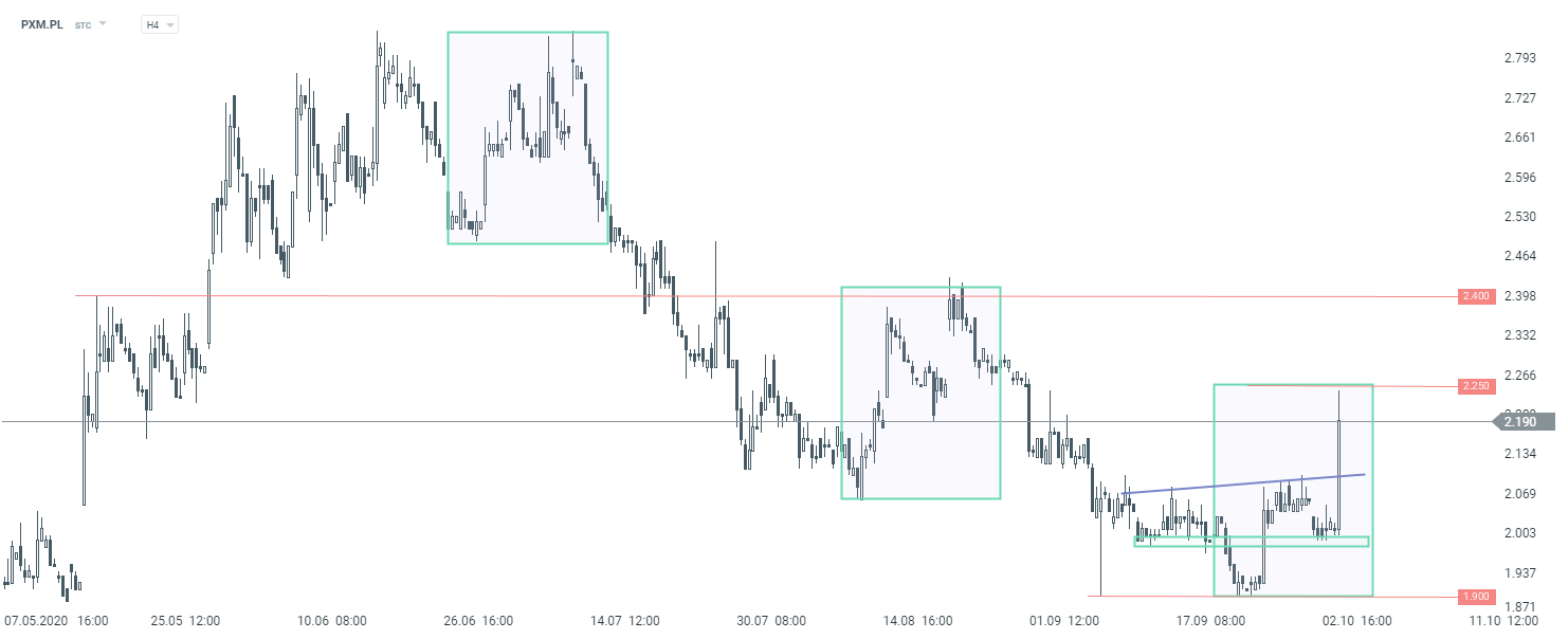 Patrząc technicznie na wykres, dzisiejszy wystrzał w górę mogła zapowiadać lokalna formacja oRGR, którą dobrze widać na interwale H4. Wczoraj notowania broniły wsparcia wynikającego prawego ramienia układu przy poziomie 2 zł, z kolei dziś od początku sesji możemy obserwować silne wzrosty. Niemniej warto zauważyć, że obecny ruch wzrostowy jest niemal identyczny jak dwa poprzednie, dlatego też poziom 2,25 zł powinien stanowić kluczowy opór. W przypadku jego pokonania, tendencja w średnim terminie może się zmienić na wzrostową.