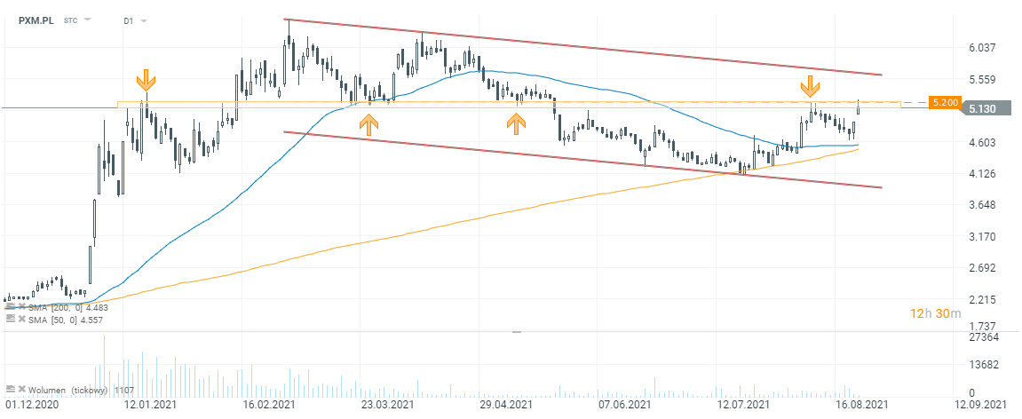 Patrząc na wykres dzienny spółki, widać ciekawą sytuację techniczną. Kurs dotarł dziś do ważnej strefy cenowej w pobliżu 5,20 PLN. W ubiegłych miesiącach okolice te stanowiły zarówno ważny opór, jak i wsparcie. Jak widać, próba wybicia z pierwszej połowy sierpnia zakończyła się niepowodzeniem, jednak byki próbują dziś po raz kolejny. W przypadku udanego wybicia uwaga mogłaby się skupić na linii trendu spadkowego poprowadzonej po niedawnych szczytach. Z drugiej strony, 200-sesyjna średnia krocząca (pomarańczowa linia) służyła w ostatnich tygodniach jako ważne wsparcie, stąd warto zwrócić na nią uwagę w przypadku cofnięcia.