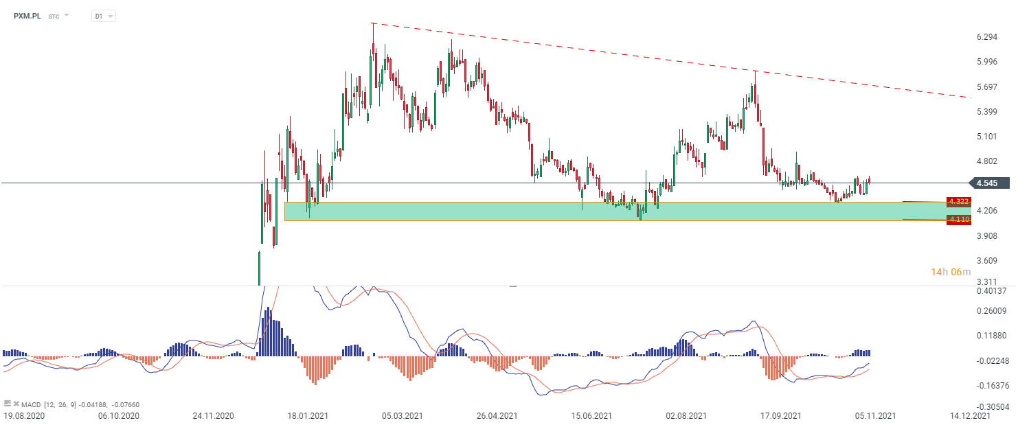 Spoglądając na walory spółki z perspektywy analizy technicznej, cena od początku 2021 roku kreśli formację trójkąta zniżkującego, która podręcznikowo, może świadczyć o zbliżającym się ruchu spadkowym. Nie mniej jednak, aktualne strefa wsparcia między 4,3 zł za akcję a 4,10 zł wydaje się być obszarem w którym strona popytowa chętnie dokonuje zakupów. Scenariusz pro-wzrostowy może być dodatkowo wzmocniony dobrymi wynikami kwartalnymi oraz byczym przecięciem poniżej linii bazowej wskaźnika MACD. Jeśli natomiast to niedźwiedziom uda się zdominować rynek akcji Polimexu, inwestorzy powinni zwrócić uwagę na wsparcie blisko poziomu 3,8 zł za akcję.