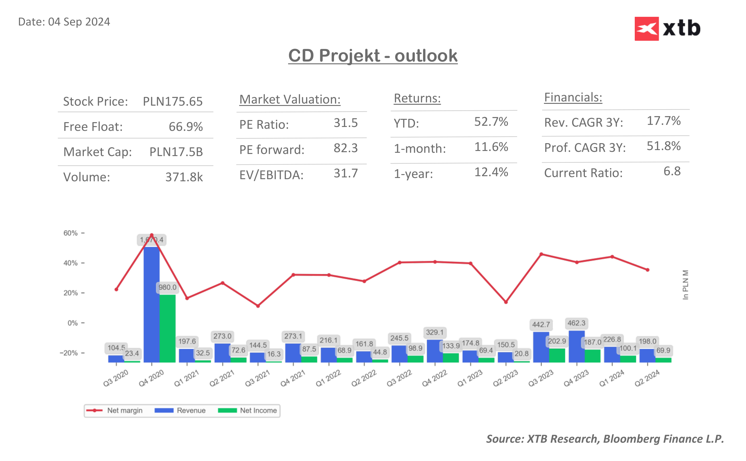 Ostatnią dużą premierą studia pozostaje dodatek do gry Cyberpunk 2077 Widmo Wolności, która odbyła się 26 września 2023 r. Stąd tak naprawdę minął ostatni kwartał, w którym wyniki porównywane były w ujęciu r/r do kwartałów bez wpływu sprzedaży dodatku. Dynamika zarówno sprzedaży, jak i samych wyników w 3 kwartale będzie ujemna ze względu na skokowe wyniki spowodowane sprzedażą dodatku w 3Q23. Mimo to warto zauważyć, że sprzedaż dodatku wpłynęła nie tylko pozytywnie na wyniki spółki pod względem napływów spowodowanych zakupem samego dodatku, ale także wspomogła przychody generowane przez podstawową grę. Poza zwiększonym popytem spowodowanym samą premierą dodatku w 1 połowie 2024 r. istotnym katalizatorem zwiększającym popularność Cyberpunka była seria aktualizacji 2.1, które tak naprawdę doprowadziły grę do stanu, jakiego gracze oczekiwali wraz z premierą tytułu w 2020 r. Wraz z poprawieniem kluczowych błędów, nowym dodatkiem i serią aktywności marketingowych tj. darmowy trial pozwalający nowym graczom przetestować grę, Cyberpunk wrócił w łaski graczy, a recenzje na platformie Steam powróciły na trwałe powyżej rejonu 80% pozytywnych recenzji, co w ujęciu serii negatywnych opinii z premiery gry można uznać za naprawdę bardzo dobry wynik. Poza Cyberpunkiem dalej istotną składową wyników CD Projektu jest popularność poprzedniej gry studia, czyli Wiedźmina 3. Po majowej publikacji nowego narzędzia do modowania Redkit gra w czerwcu zanotowała istotny wzrost liczby graczy na Steamie, która dopiero w okolicy obecnego września powróciły do wartości sprzed premiery. Oczywiście napływ liczby graczy nie oznacza od razu większych wpływów ze sprzedaży, gdyż część z tych graczy stanowiły osoby, które grę zakupiły już wcześniej, natomiast z perspektywy spółki w przypadku 9-letniego tytułu głównym celem jest spowalnianie tempa spadku przychodów z gry, co jak na razie CD Projektowi się udaje.