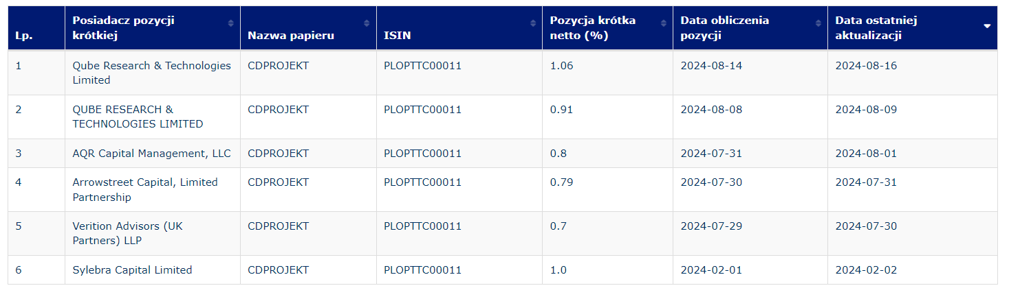 Fundusze inwestycyjne ciągle zwiększają swoją pozycję krótką na akcjach CD Projektu. Obecnie według rejestru krótkiej sprzedaży publikowanej przez KNF udział krótkich pozycji funduszy posiadających ponad 0,5% akcji spółki wzrósł do 4,35%. Od początku tego miesiące dwa fundusze - Qube Research & Technologies oraz AQR Capital Management zwiększyły swoją krótką pozycję. Pozycja Qube Research wzrosła o 0,16 p.p. (przekraczając tym samym poziom 1%), a AQR Capital Management o 0,1 p.p.