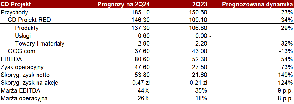 Prognozowane przez konsensus analityków wyniki zakładają osiągnięcie przez CD Projekt przychodów w wysokości 185 mln zł, co oznacza dynamikę na poziomie 23% r/r. Najmocniej do wyniku ma dołożyć się segment CD Projekt RED, którego prognozowana dynamika przychodów wynosi 34% r/r. Spośród kluczowych danych finansowych jedynie sprzedaż generowana przez GOG.com ma zanotować spadek o ok. -13%. Dalej jednak segment ten nie jest kluczowy z perspektywy ogólnych przychodów i wzrosty ze sprzedaży gier i produktów z marki CD Projektu przebijają ewentualną erozję sprzedaży GOG.com. Spółka ma także mocno poprawić swoją zyskowność, wraz z prognozowanym wzrostem wyniku EBITDA do 80,6 mln zł (+54% r/r), a także wyniku operacyjnego do 47,6 mln zł (+73% r/r).