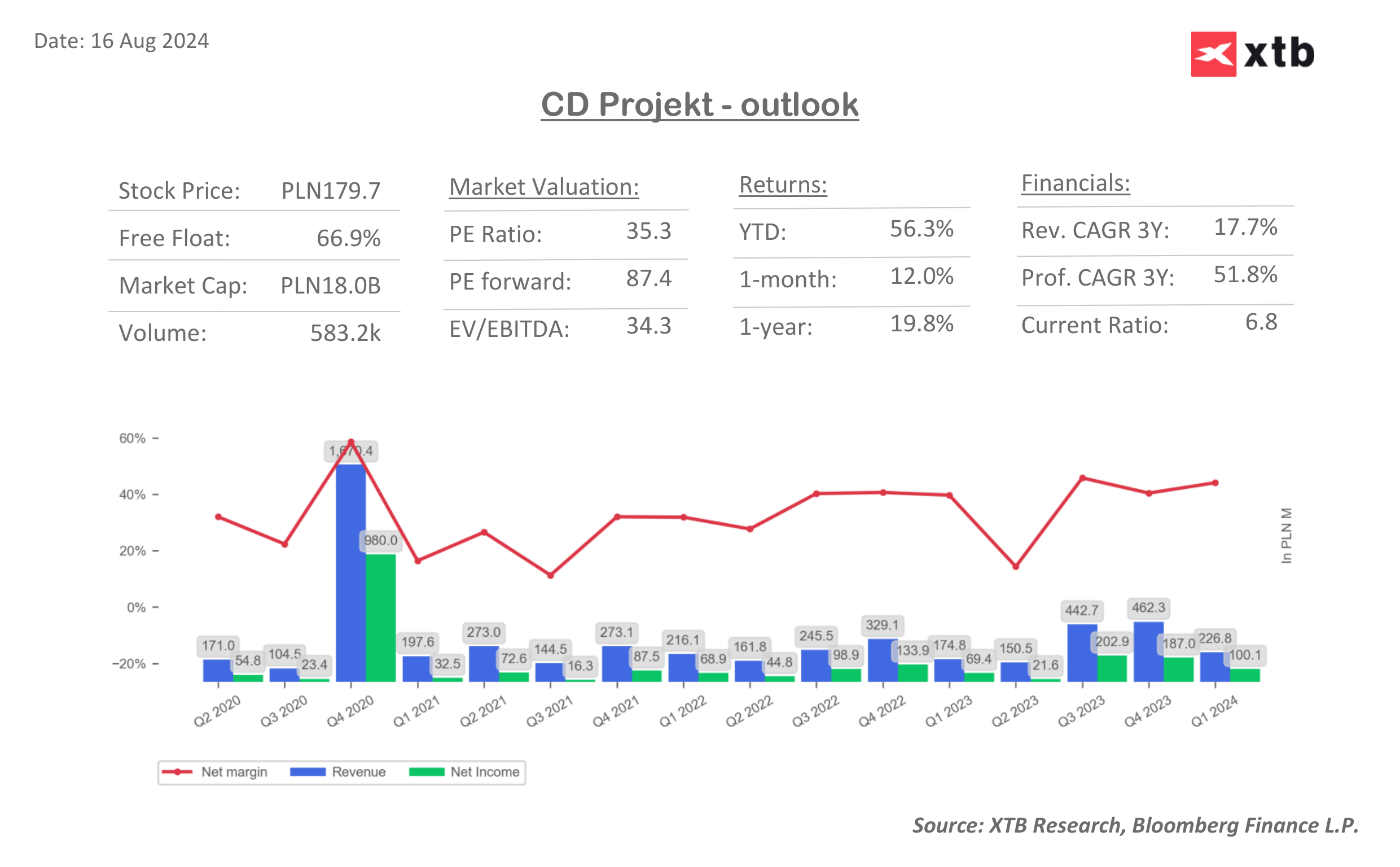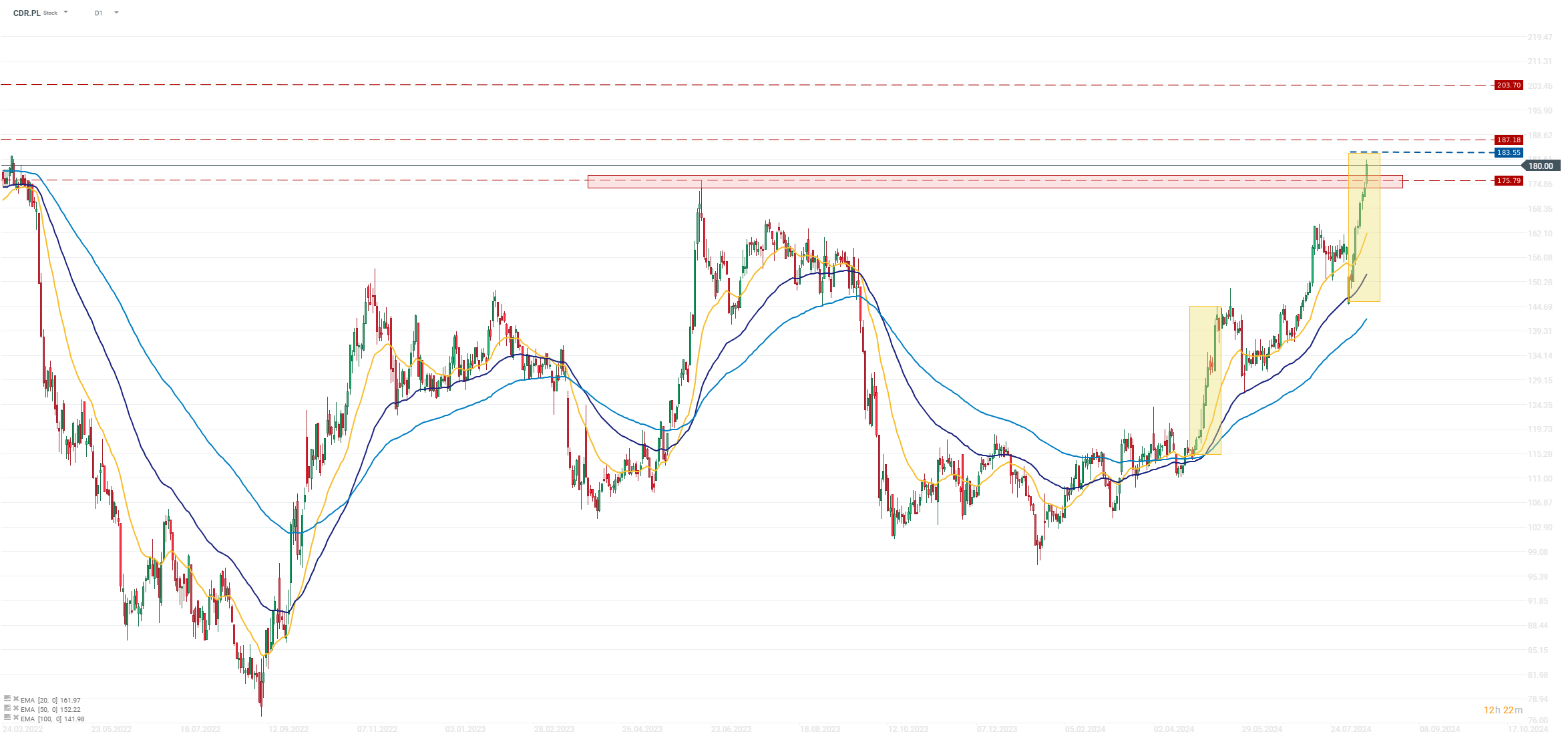 Notowania CD Projektu wybiły dziś psychologiczny poziom 180 zł. Tym samym spółka jest najwyżej notowana od marca 2023 r. Od początku sierpnia największy producent gier w Polsce wzrósł o ponad 14%. Wzrosty CD Projektu nie są podbudowane jednak nowymi informacjami fundamentalnymi, wskazującymi na jakiekolwiek nowe postępy lub aktualizacje odnośnie ich najważniejszego projektu, jakim obecnie jest najnowsza gra z wiedźmińskiej serii. Wydaje się, że notowania spółki zaczynają podążać bliźniaczą drogą do sytuacji sprzed publikacji wyników za 1Q24.