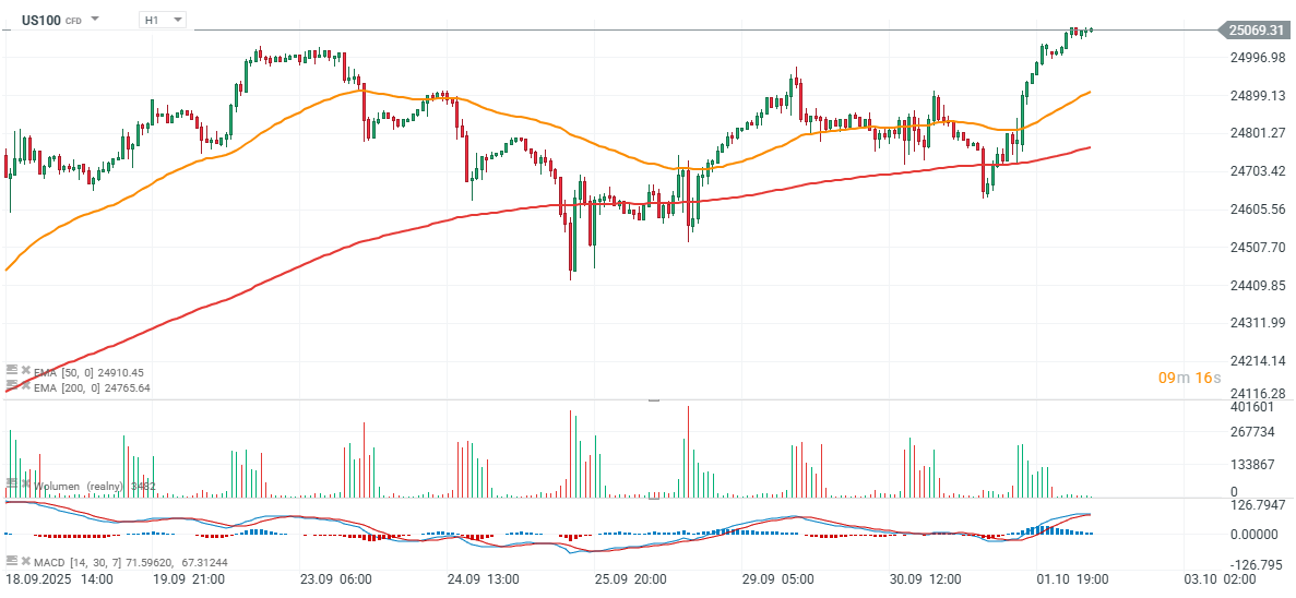 - Azjatycki rajd przełożył się na lepsze nastroje na kontraktach terminowych w Europie i USA; kontrakty na US100 rosną o 0,25%, kierując się w stronę poziomu 25 100 pkt. O godz. 11:00 poznamy dane z rynku pracy euro, o 14:30 Departament Pracy USA miał opublikować cotygodniowe wnioski o zasiłek z USA, a o 16:00 zrewidowane zamówienia na dobra trwałe — publikacja stoi pod znakiem zapytania wobec zamknięcia rządu