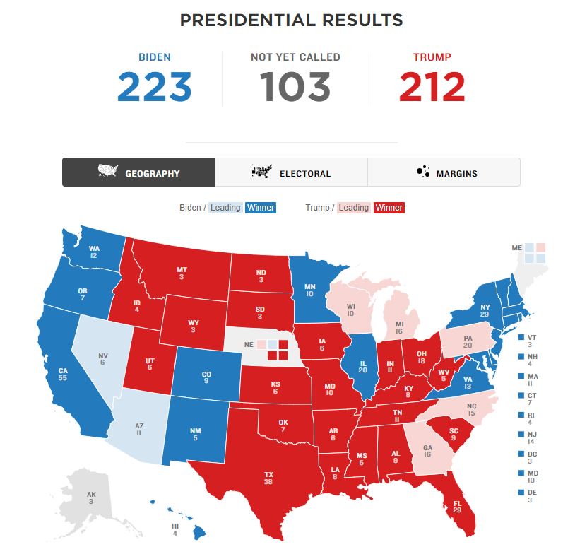 Według NPR, Biden zdobył jak do tej pory około 223 głosów elektorskich, a Trump 212. Według Fox, zarówno Biden jak i Trump zdobyli do tej pory po 233 głosy