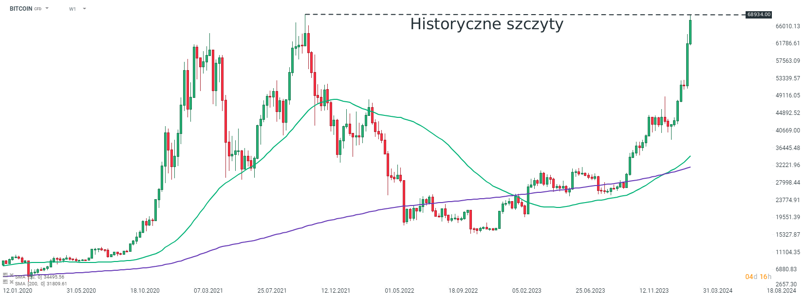 Bitcoin zbliża się do historycznych szczytów. Kryptowaluta wyznaczyła dzienny szczyt w okolicach 68 700 USD - niecałe 300 USD poniżej rekordów z 2021 roku. Źródło: xStation5