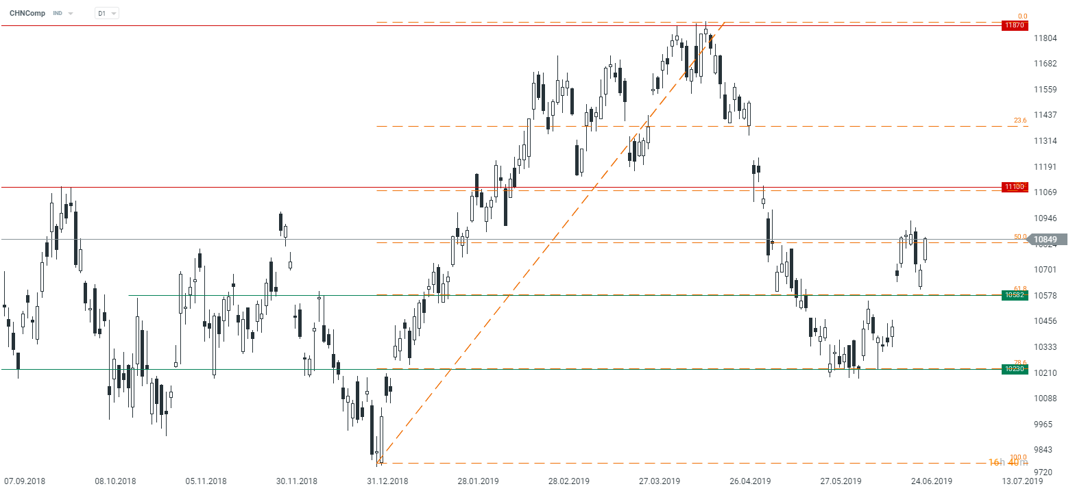 Hang Seng ponownie powrócił w okolicę 50% zniesienia ostatniej dużej fali wzrostowej. Źródło: xStation5