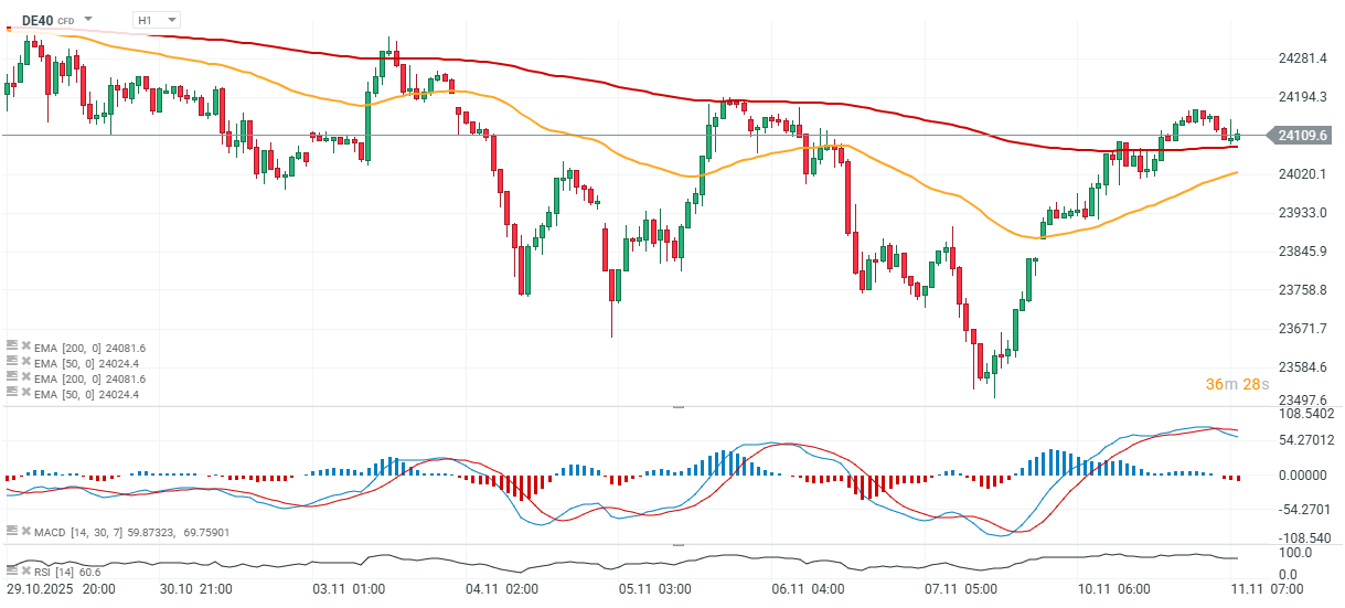 Indeksy giełdowe w Europie nieznacznie tracą, po słabszej sesji w Azji, gdzie spadały zarówno japoński Nikkei, jak i Hang Seng. Indeks obserwatorów ekonomicznych z Japonii wzrósł do 49.5 wobec 47.1 prognoz i 47.5 poprzednio. Metale szlachetne zyskują częściowo dzięki perspektywie zamknięcia rządu, a złoto notowane jest w okolicach 4130 USD za uncję. Surowce energetyczne nieznacznie spadają; ropa i gaz ziemny znajdują się dziś pod presją.