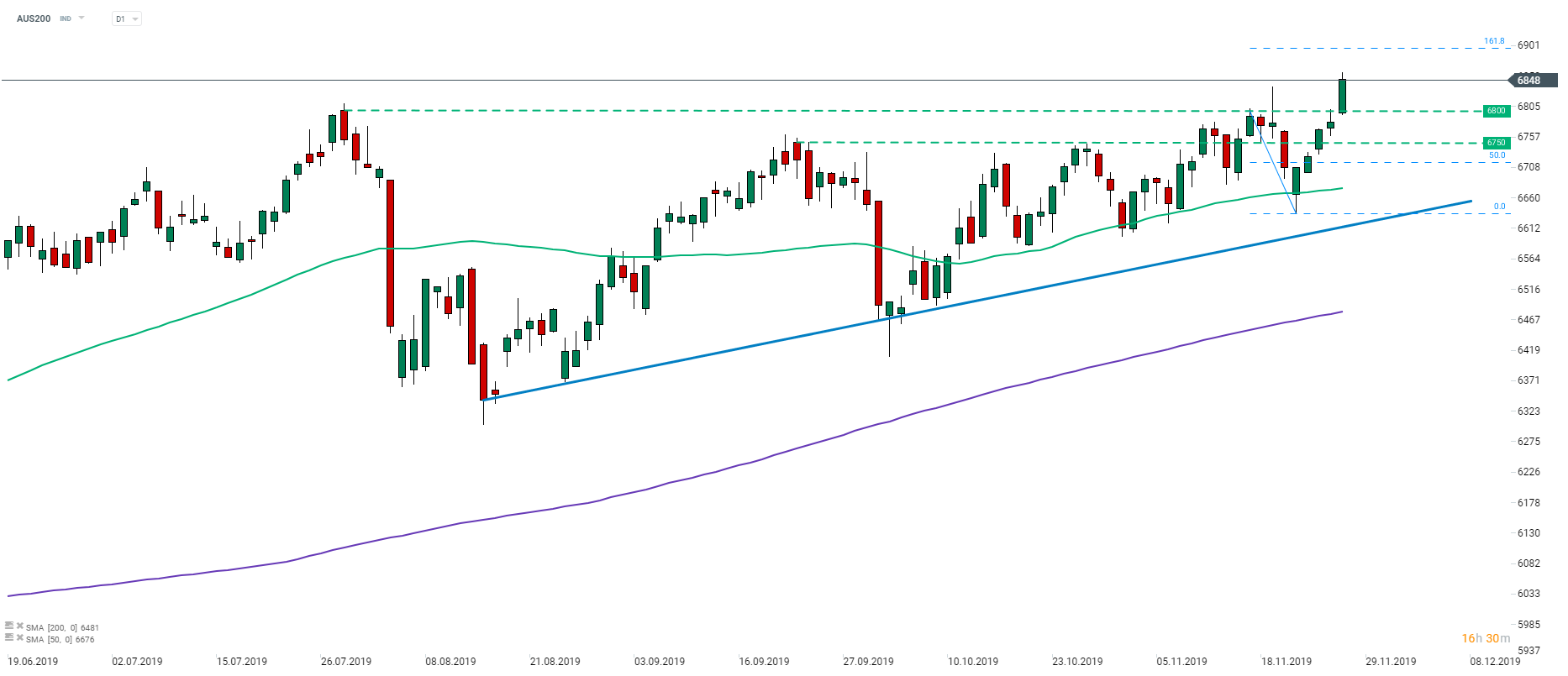 Powodem dobrej kondycji australijskich akcji mogą być komentarze banków Westpac i RBC oraz wynikająca z nich słabość AUD. Westpac powiedział, że oczekuje 2 obniżek stóp ze strony RBA w 2020 roku, a nawet rozpoczęcia programu QE. W podobnym tonie wypowiedział się RBC, jednak ten bank oczekuje rozpoczęcia luzowania ilościowego w 2021 roku