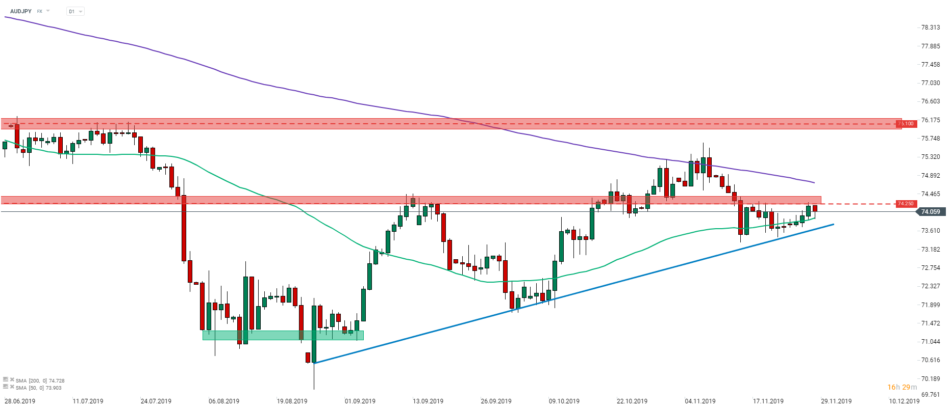 AUDJPY cofa się z okolic strefy opór rozciągającej się powyżej poziomu 74,25. Ruch jest następstwem podpisania ustawy ws. Hongkongu, która może doprowadzić do pogorszenia relacji między dwoma największymi gospodarkami świata. Początkowy ruch spadkowy został zatrzymany przez 50-sesyjną średnią kroczącą, jednak niedźwiedzie wciąż utrzymują kontrolę. Źródło: xStation5