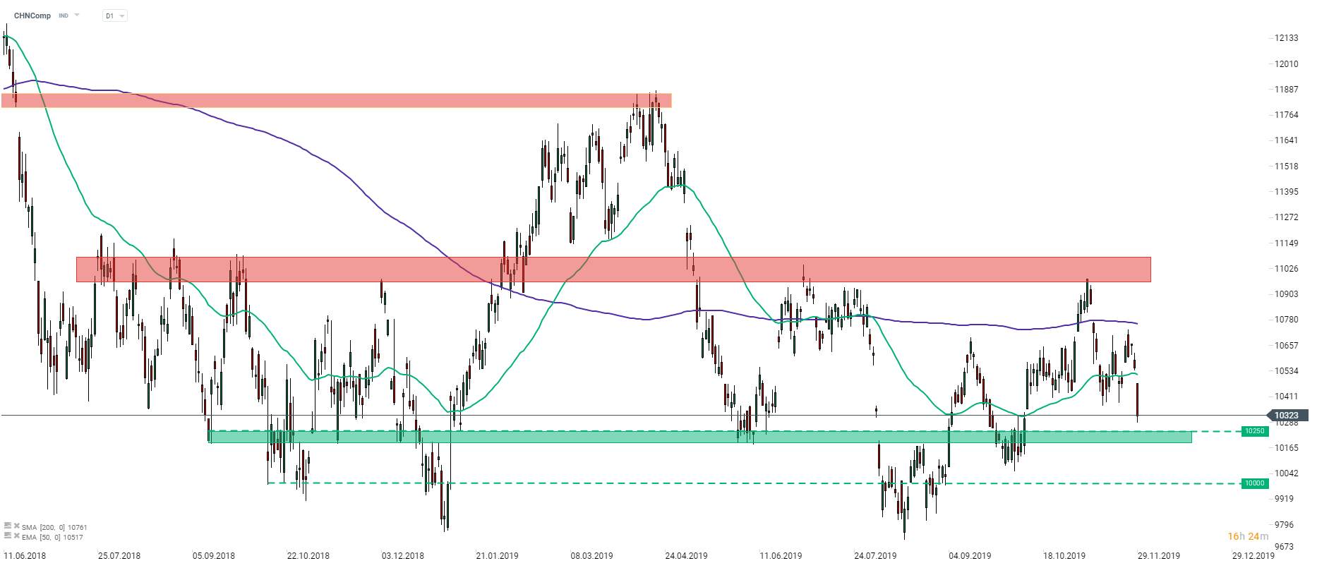 Indeks CHNComp doświadcza dziś silnego spadku za sprawą utrzymującej się niepewności co do przyszłości amerykańsko-chińskich relacji handlowych. Najbliższym wsparciem jest strefa rozciągająca się poniżej poziomu 10250 pkt. Źródło: xStation5