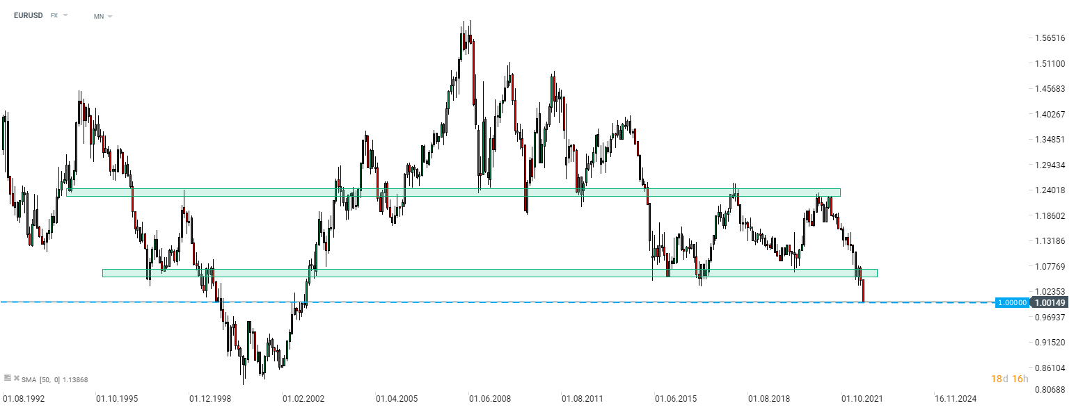 EURUSD zbliża się do parytetu. Dołek jak na razie został wyznaczony przy 1,0005. Główna para walutowa notowana jest na poziomach niewidzianych od końcówki 2002 roku. Powody przeceny są dwa - powolne działania EBC oraz zbliżający się kryzys gazowy, który najprawdopodobniej doprowadzi do recesji. EURUSD, interwał miesięczny. Źródło: xStation5