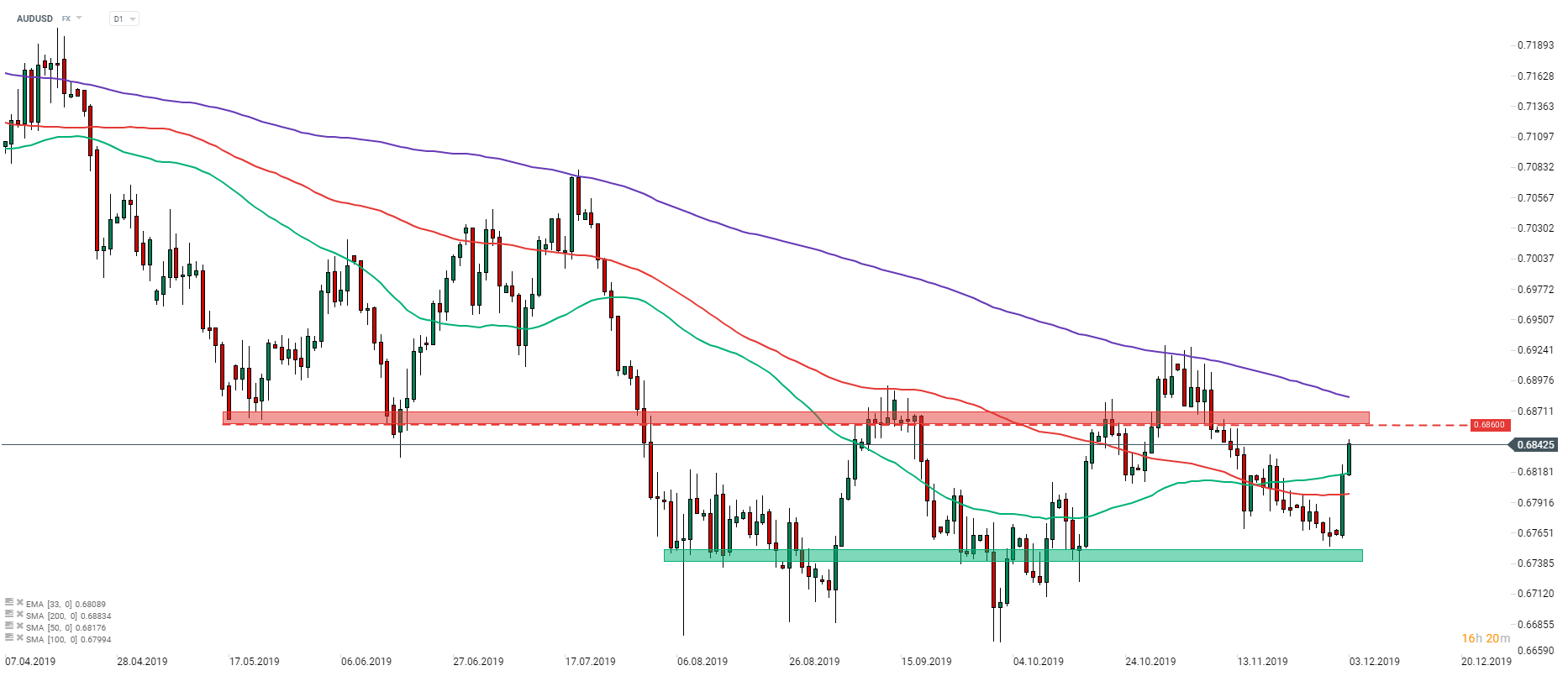 AUDUSD zyskuje po tym jak RBA zakomunikował, że część ryzyk osłabła. Para zbliża się do strefy oporu rozciągającej się powyżej poziomu 0,6860. Niemniej kluczowym oporem jest 200-sesyjna średnia krocząca (fioletowa linia), która hamuje ruchy wzrostowe AUDUSD od kwietnia 2018 roku. Źródło: xStation5