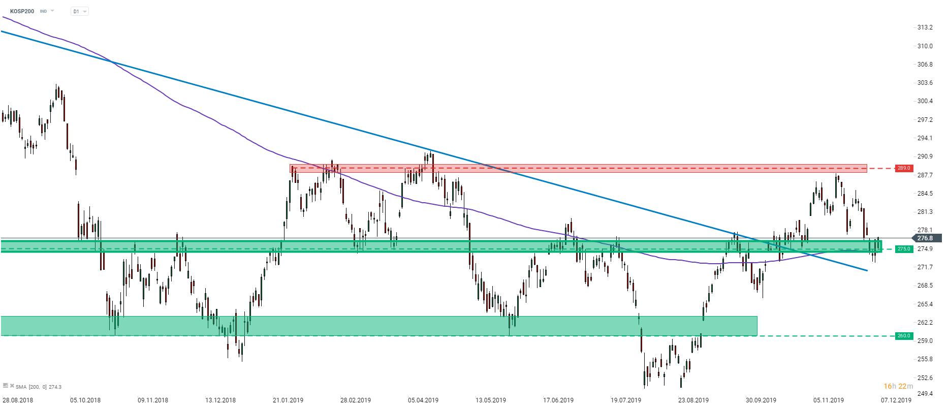 Koreański indeks (KOSP200) cofnął się po nieudanej próbie przebicia powyżej strefy opór rozciągającej się wokół poziomu 289 pkt. Indeks zatrzymał spadki na strefie wsparcia przy poziomie 275 pkt i próbuje wyprowadzić kolejny ruch wzrostowy. Źródło: xStation5