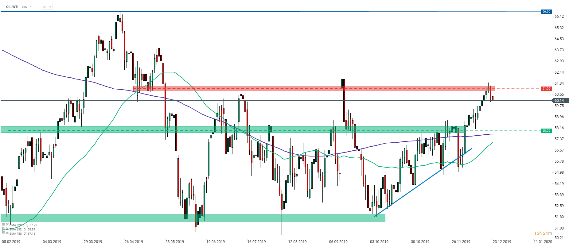 Od początku października na rynku ropy możemy obserwować ruch wzrostowy. Tempo tego ruchu przyspieszyło po pokonaniu strefy oporu rozciągającej się wokół poziomu 58 USD. Niemniej cena “czarnego złota” cofnęła się w piątek z okolic poziomu 61 USD za baryłek, a ruch ten jest dziś kontynuowany. Źródło: xStation5