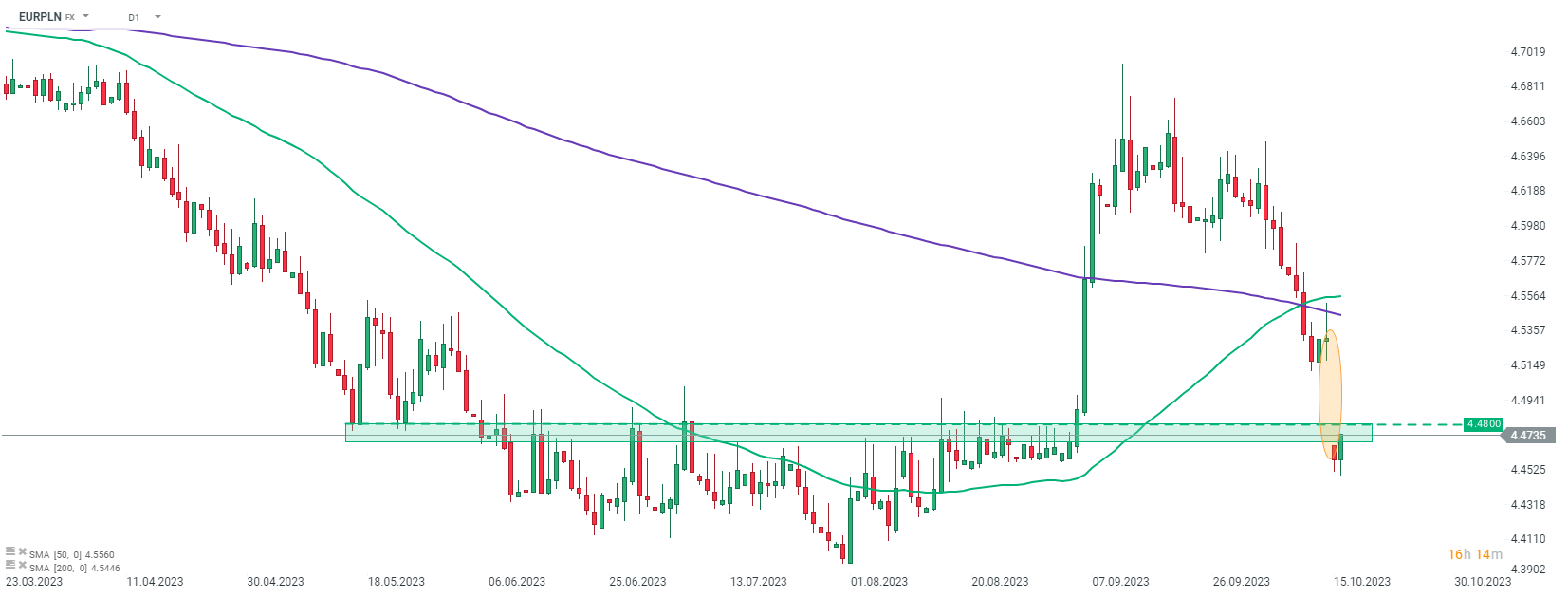 EURPLN otworzył się dużą luką spadkową po wyborczym weekendzie. Para spadł poniżej 4,48 i znajduje się na poziomach niewidzianych od początku września. Źródło: xStation5