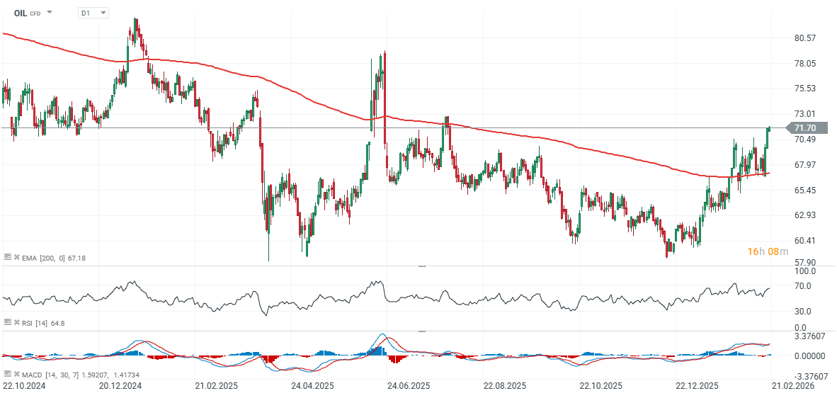 Ropa naftowa osiągnęła 6-miesięczne maksima, a globalne rynki akcji znalazły się pod presją, ponieważ rosnące napięcia wokół Iranu pogorszyły apetyt na ryzyko. Brent wzrósł o 0,5% do 72 USD za baryłkę po tym, jak Donald Trump stwierdził, że Iran ma maksymalnie 15 dni na osiągnięcie porozumienia nuklearnego, a USA rozlokowały dodatkowe siły marines na Bliskim Wschodzie. Tygodniowy wzrost notowań ropy przekracza obecnie 6%.