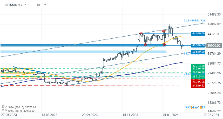 Bitcoin utrzymuje się w okolicy 40,000 USD bez większych zmian w pierwszej części dnia. Źródło: xStation 5