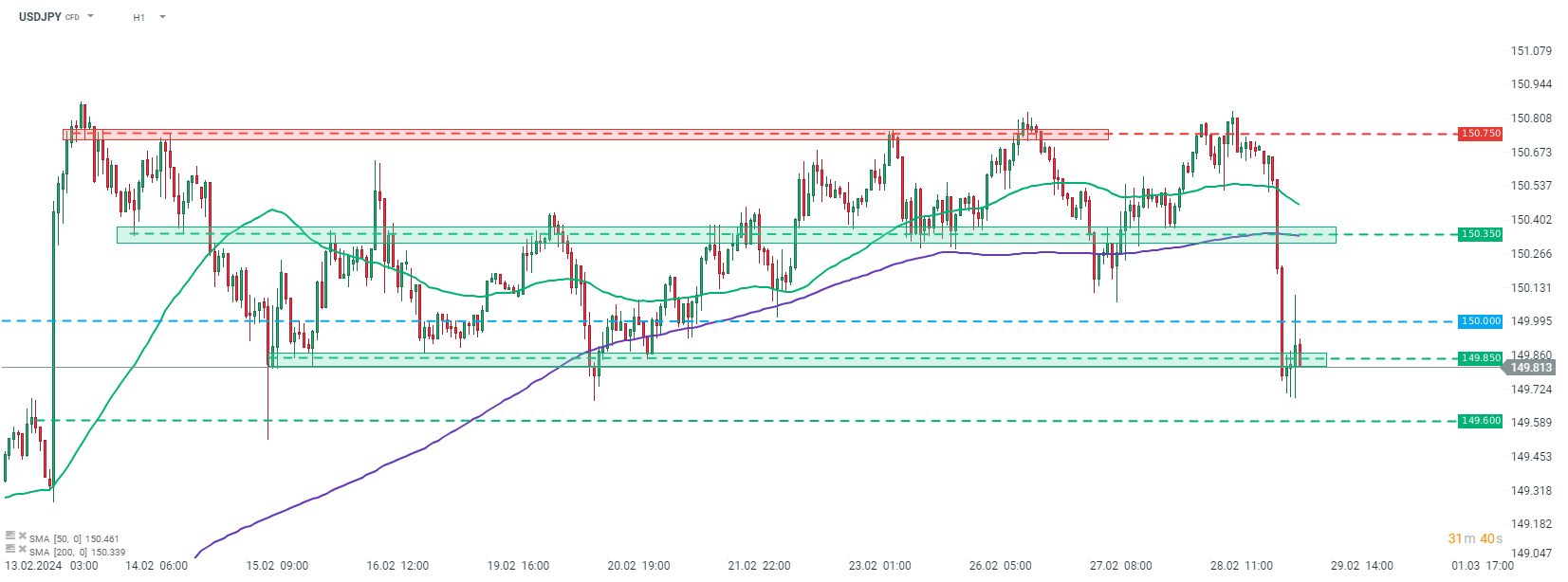 USDJPY spada poniżej poziomu 150,00 po jastrzębich komentarzach Takaty z Banku Japonii. Źródło: xStation5